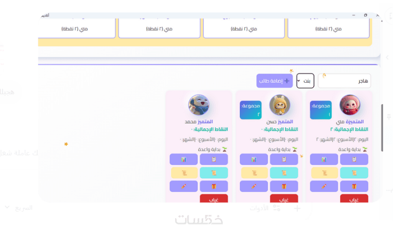 إدارة كاملة للفصل: إضافة أسماء الطلاب، رصد السلوك، وتوزيع النقاط بضغطة زر.