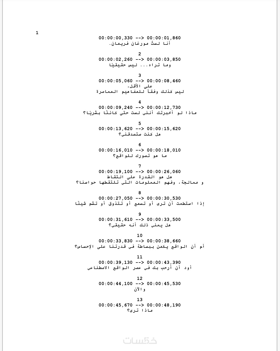 سأقوم بتزويدك بملف الترجمة النصية (بصيغة srt أو أي صيغة أخرى تفضلها) باللغة الهدف (سواء كانت الإنجليزية أو العربية)، مع ضمان المزامنة الكاملة والدقيقة مع الإطار الزمني للمحتوى المرئي أو المسموع.