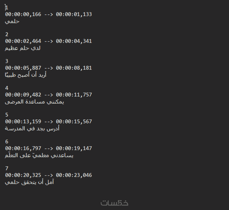 ملف ترجمة احترافي بصيغة SRT متزامن بدقة مع توقيت الكلام في الفيديو وجاهز للاستخدام على يوتيوب أو أي منصة فيديو.