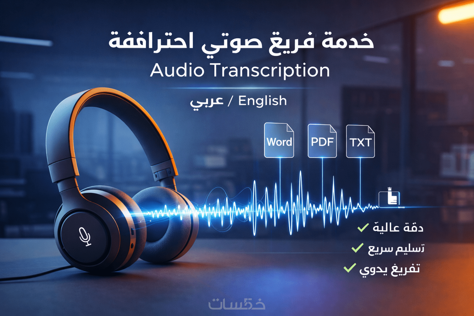 - تقديم ملف التفريغ بصيغ متعددة مع توضيح التزامن بدقة واحترافية: ass, srt, rtf, txt أو في ملف وورد بدون تزامن.