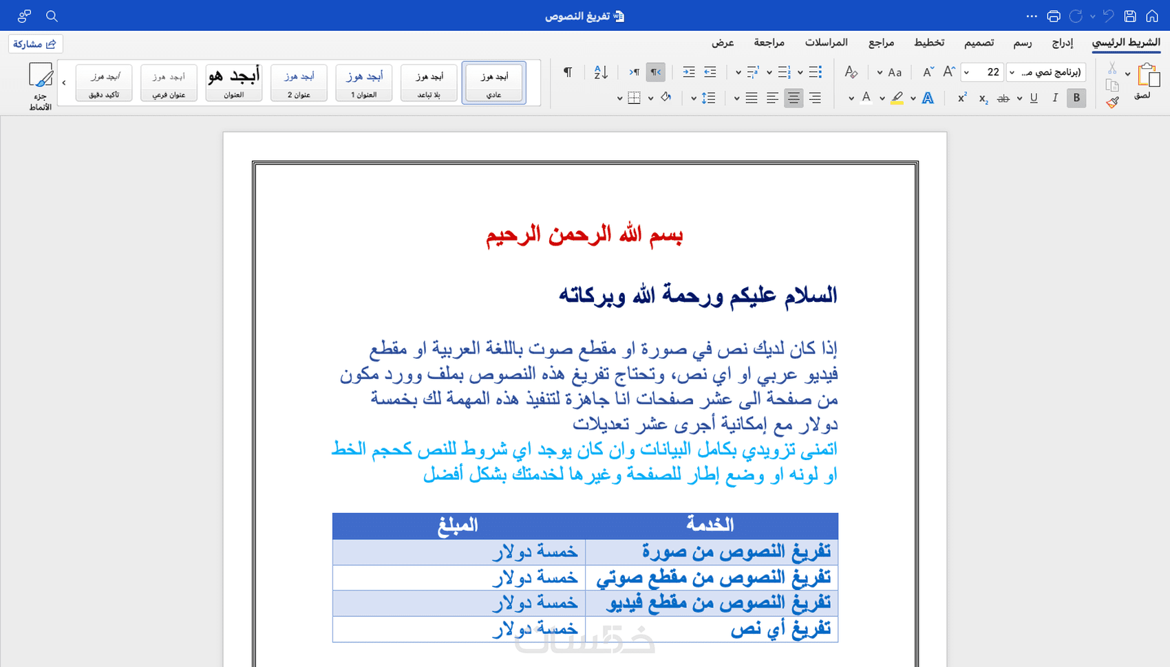 إذا كان لديك نص في صورة او مقطع صوت باللغة العربية او مقطع فيديو عربي او ملف pdf او اي نص، وتحتاج تفريغ هذه النصوص بملف وورد انا جاهزة لتنفيذ هذه المهمة لك مع إمكانية أجرى عشر تعديلات
