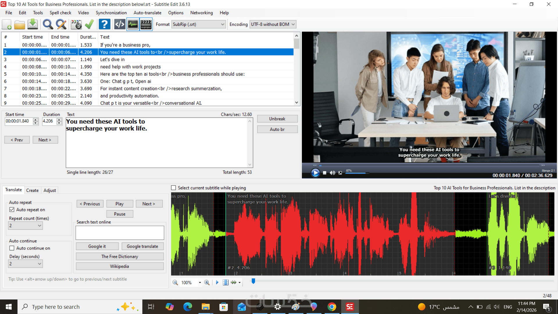 التفريغ الصوتي لفديو باللغة الإنجليزية أو اللغة العربية