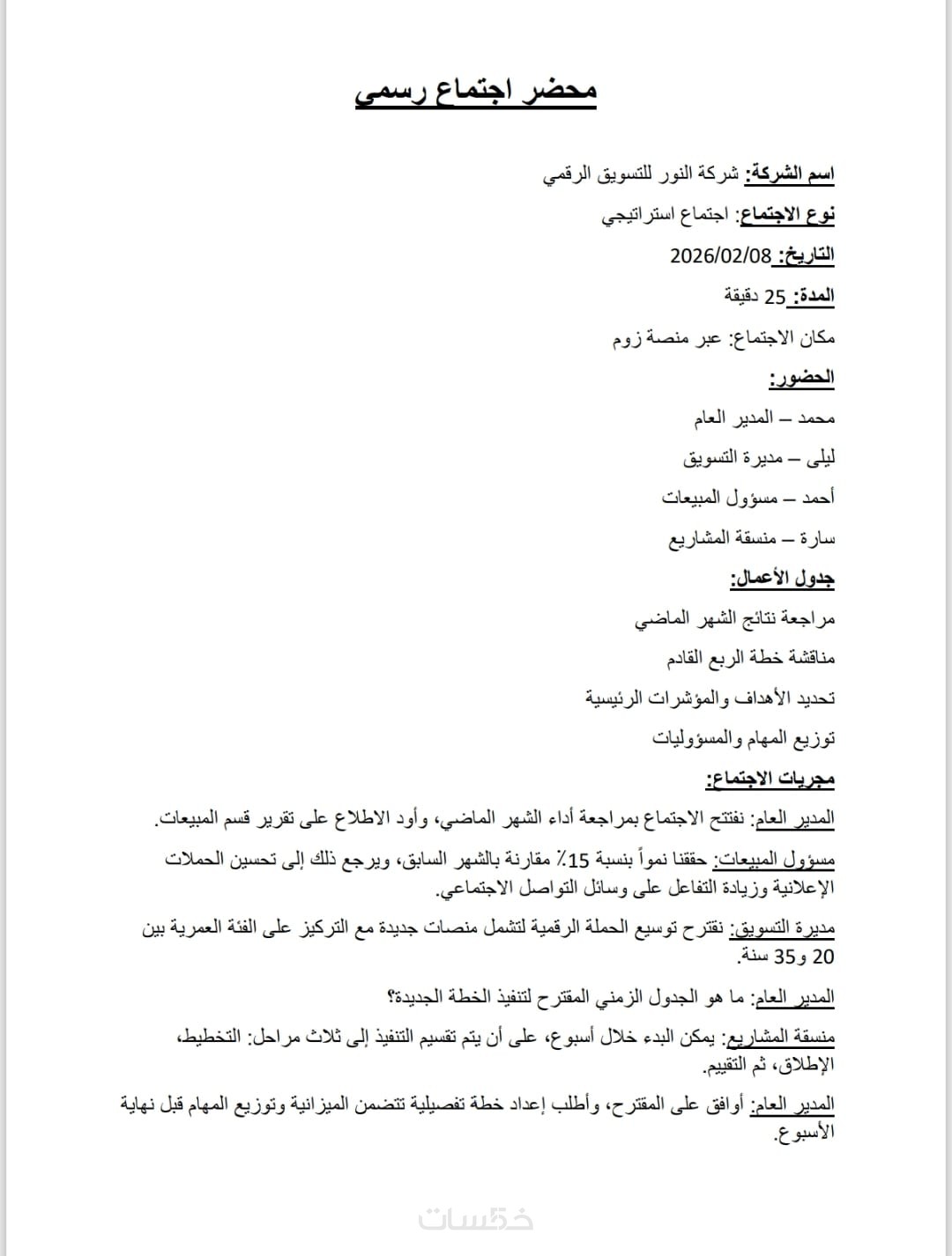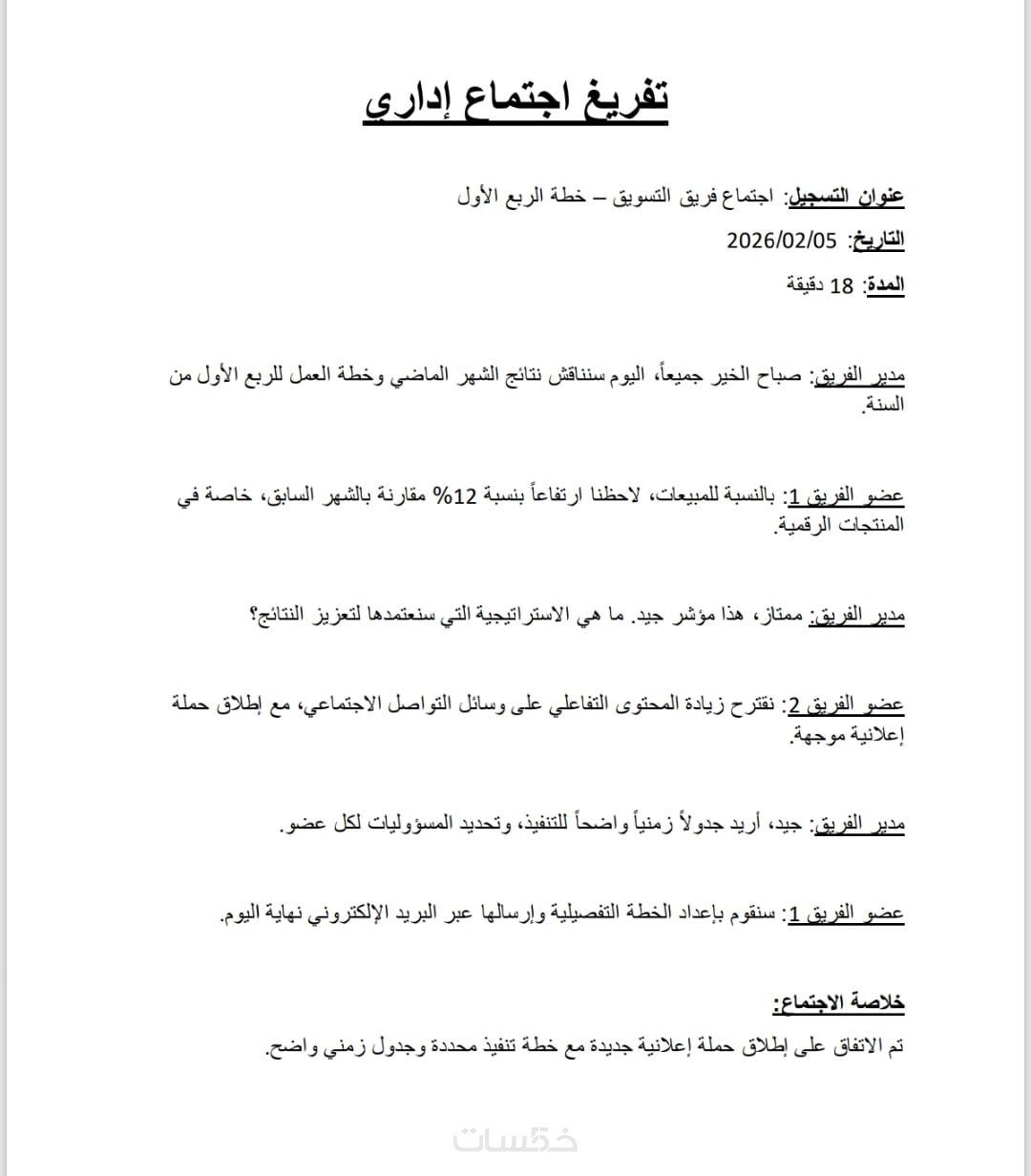 يتم تقسيم النص إلى فقرات مرتبة مع تحديد أسماء المتحدثين في حال وجود أكثر من شخص داخل التسجيل.