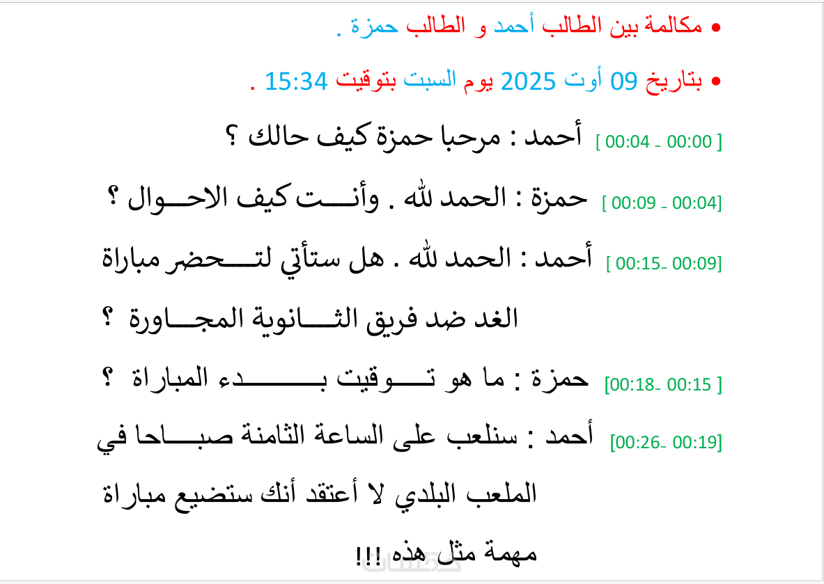 أقوم بتحويل الملف الصوتي إلى نص عربي دقيق مع تمييز المتحدثين والتوقيت الزمني