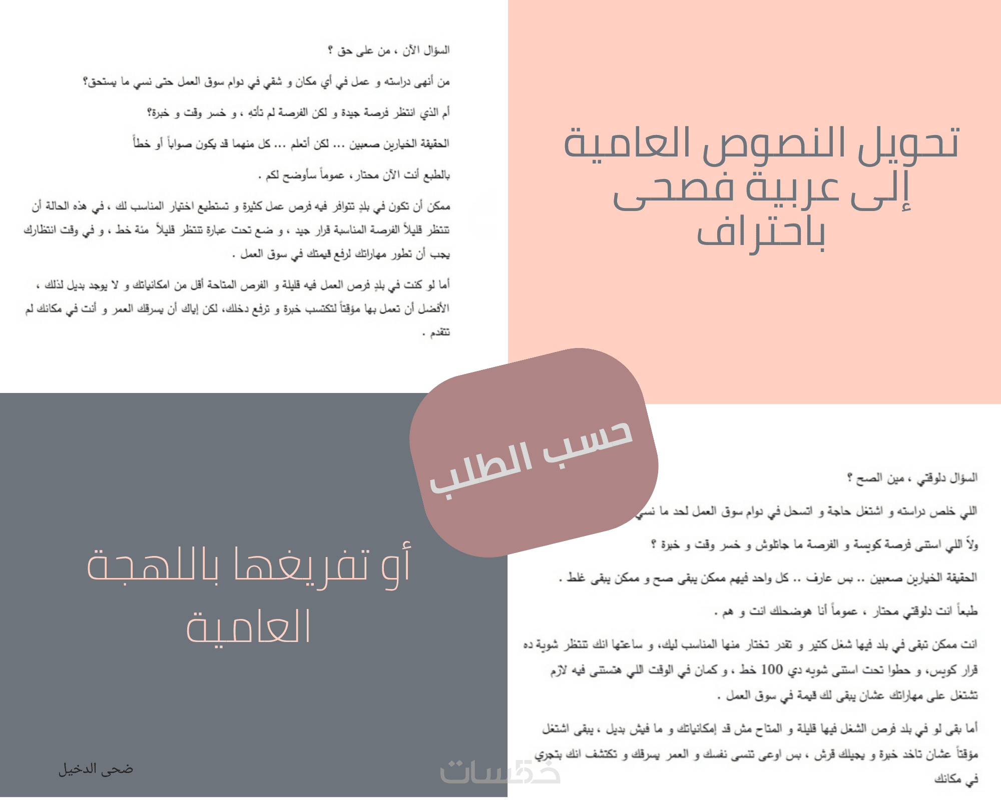 تفريغ المقاطع الصوتية أو الفيديوهات بالعربية الفصحى أو اللهجات المفهومة.