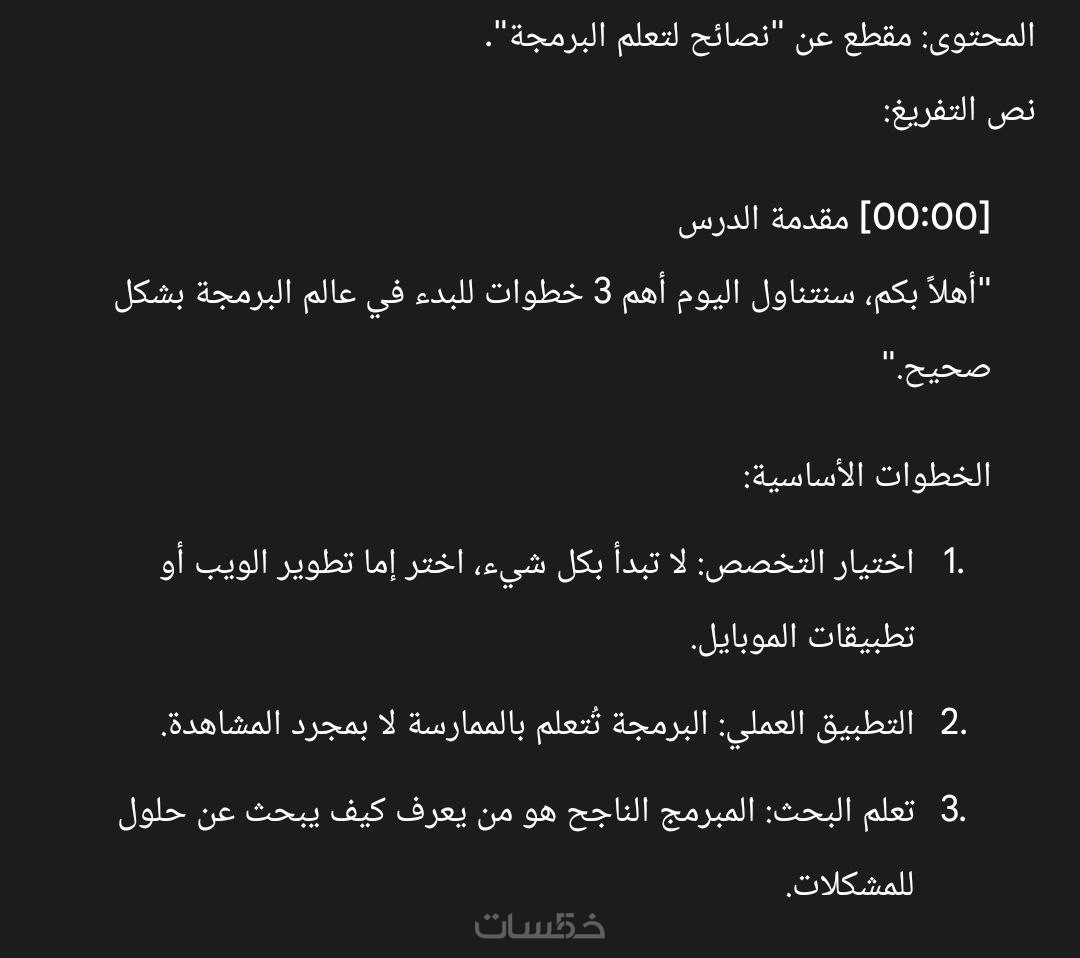 علامات زمنية: إضافة التوقيت الزمني (Time-stamps) عند الطلب لتسهيل الرجوع للمقاطع.