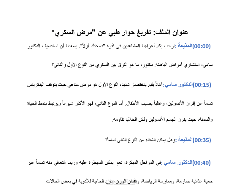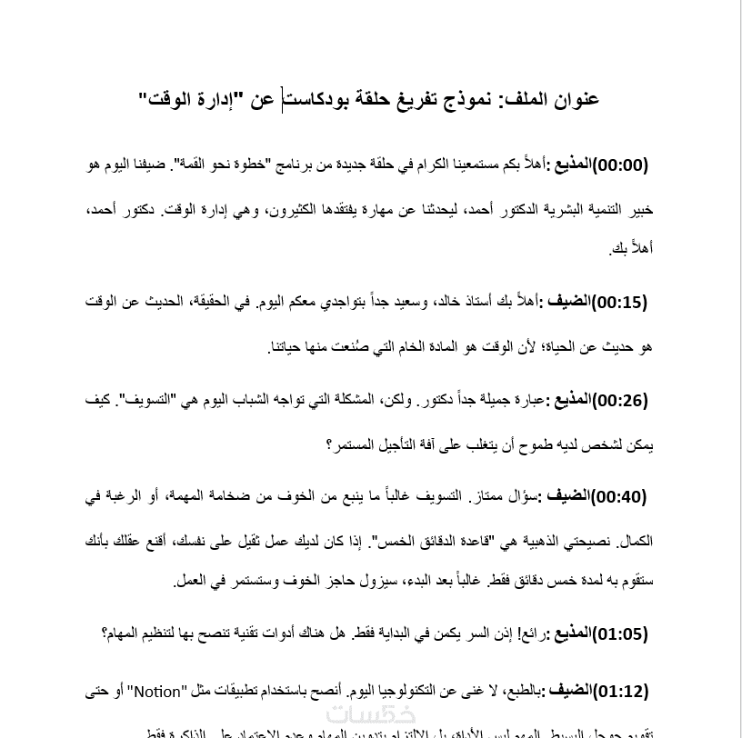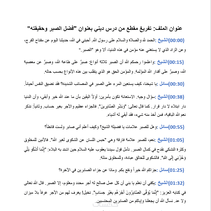 نص مكتوب مطابق للتسجيل الصوتي مع تنسيق واضح، تدقيق لغوي أساسي، وعلامات ترقيم صحيحة، بدون أخطاء إملائية.