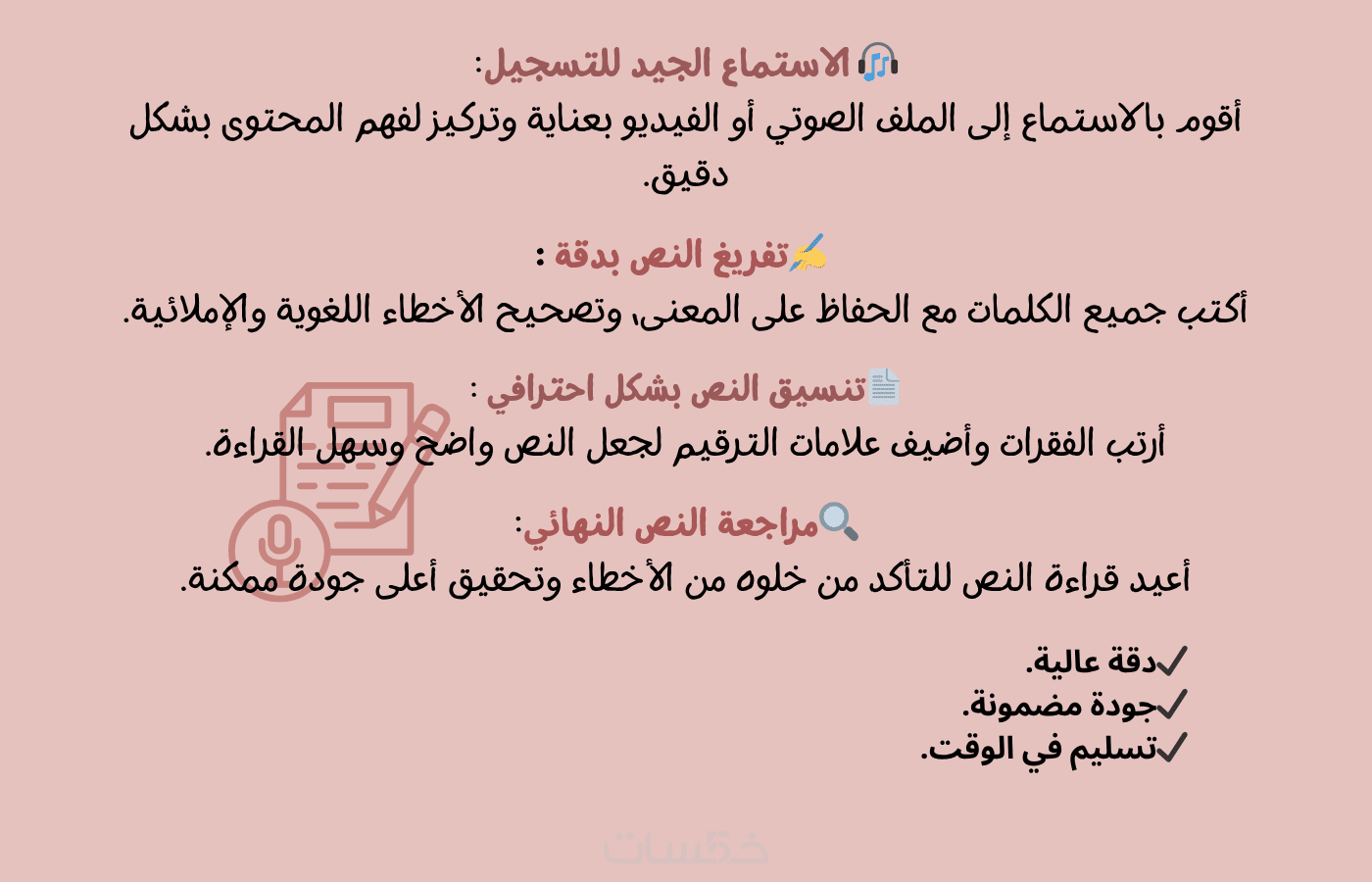 تفريغ صوتي لتسجيل قصير يوضح دقة العمل، مع الحفاظ على المعنى وتنسيق النص بشكل واضح واحترافي.
