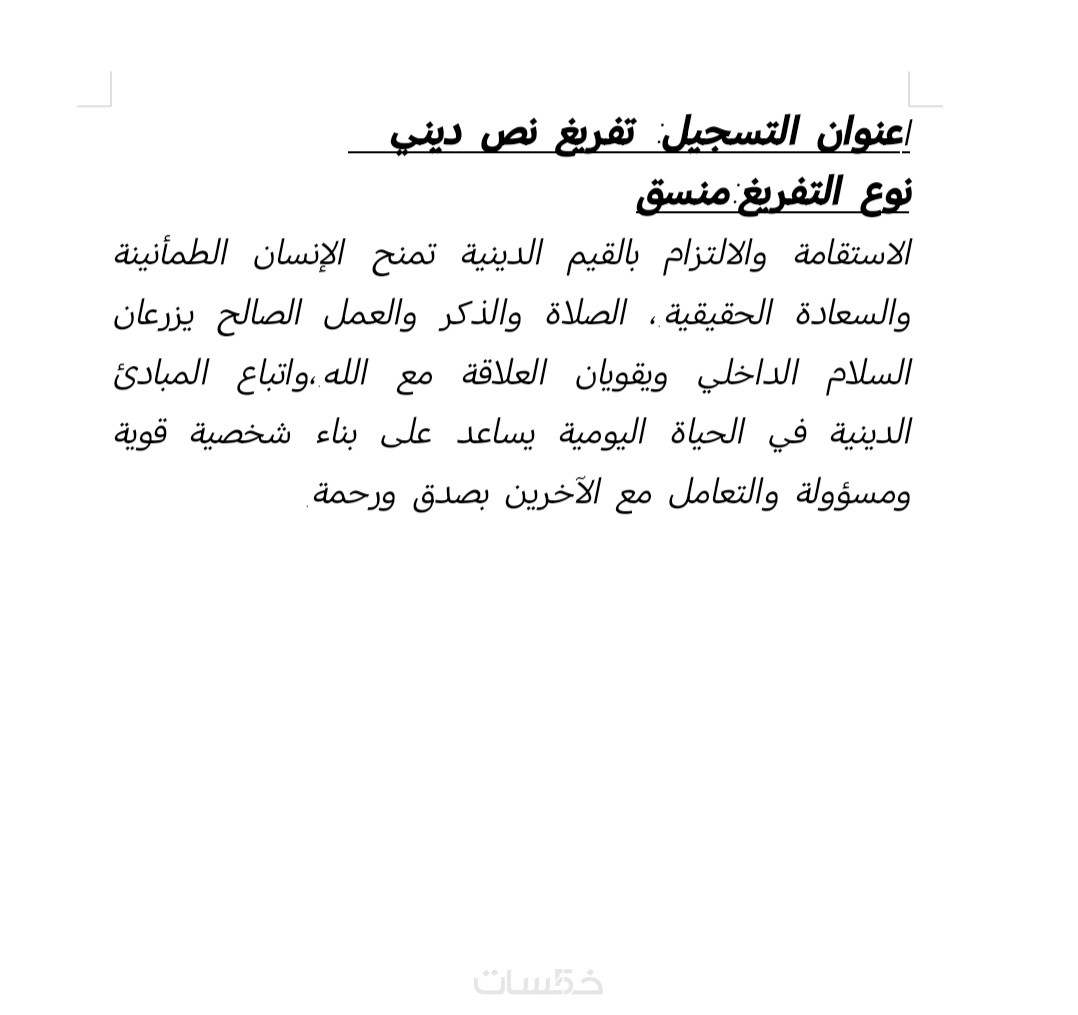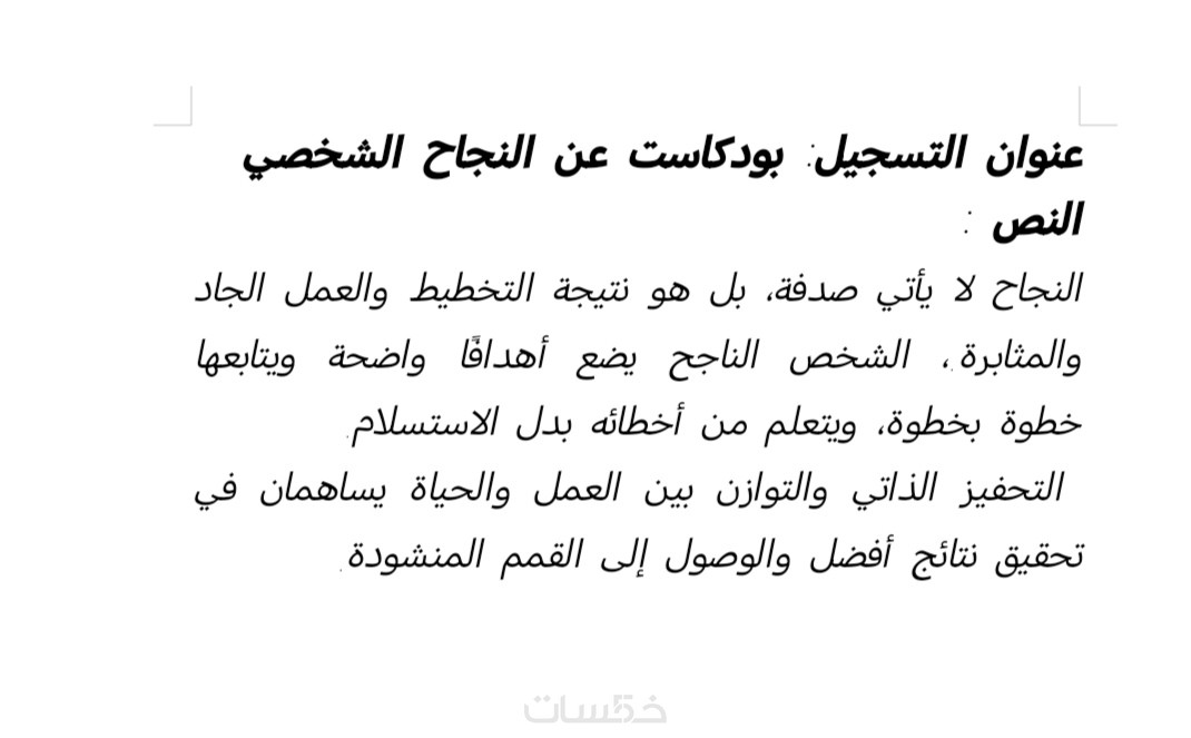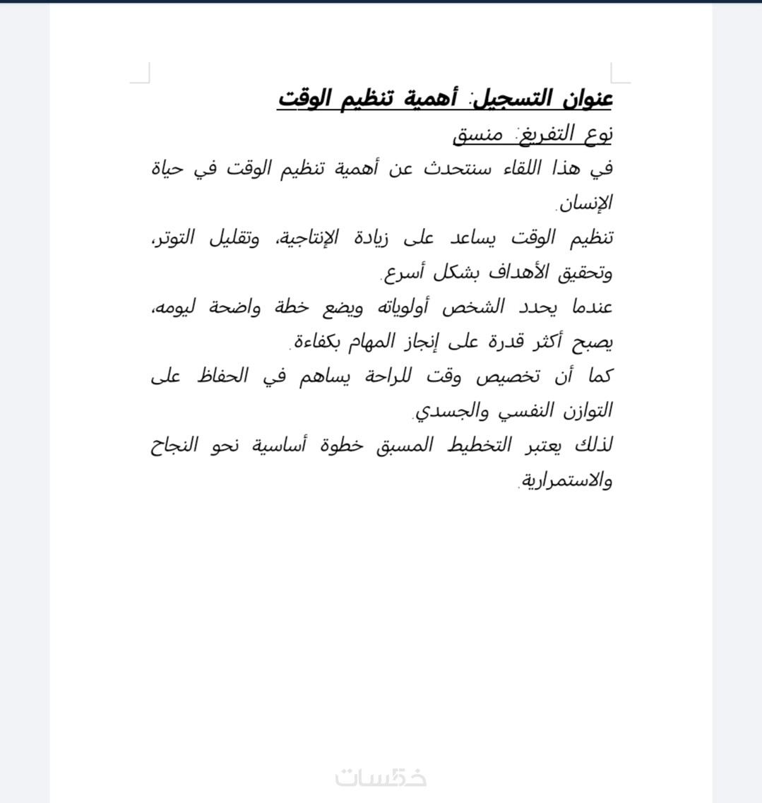 ستحصل على ملف نصي منسق يتضمن تفريغًا دقيقًا وواضحًا للتسجيل الصوتي، مع ترتيب الفقرات بشكل احترافي وتصحيح الأخطاء الإملائية وعلامات الترقيم، ليكون جاهزًا للاستخدام والنشر مباشرة بصيغة Word أو PDF.