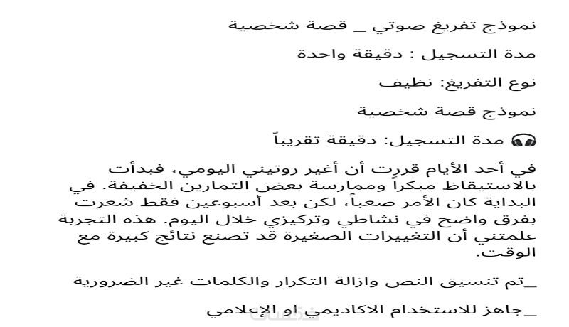 أقوم بتحويل التسجيلات الصوتية أو مقاطع الفيديو (لهجة سورية واضحة) إلى نص منسق وخالٍ من الأخطاء، مع إزالة التكرار والكلمات غير الضرورية ما لم يُطلب تفريغ حرفي.