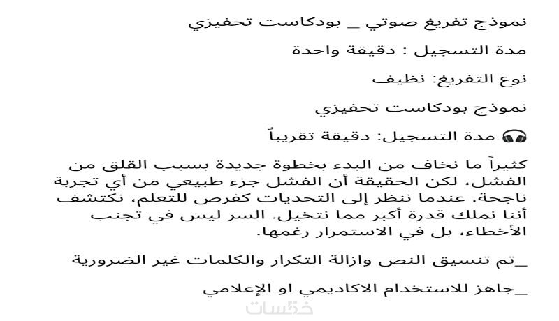 أقدم خدمة تفريغ صوتي احترافي من العربية إلى نص مكتوب بدقة عالية، مع التركيز على وضوح المعنى وتنظيم النص ليكون جاهزاً للاستخدام المباشر.