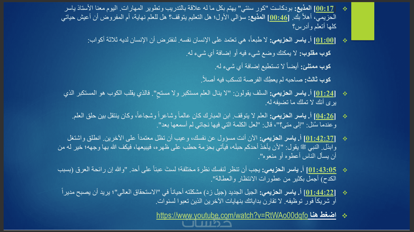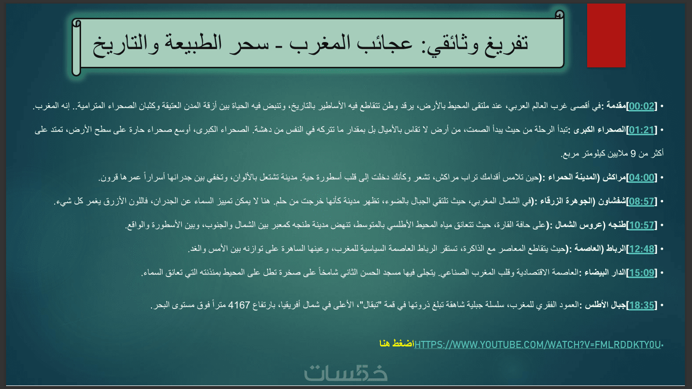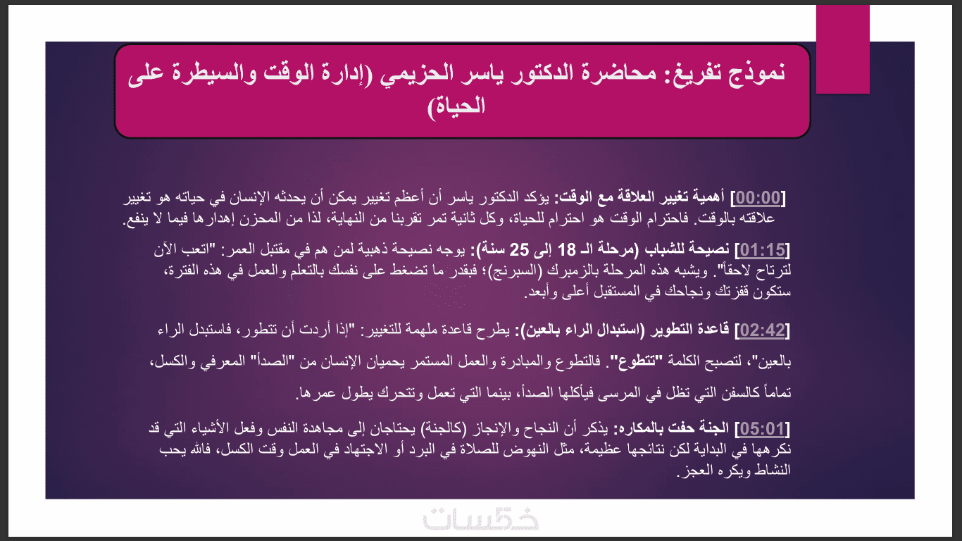 طوابع زمنية دقيقة: إضافة (Timestamps) لتسهيل الوصول إلى أي معلومة داخل المحتوى.