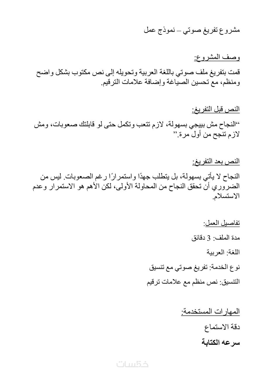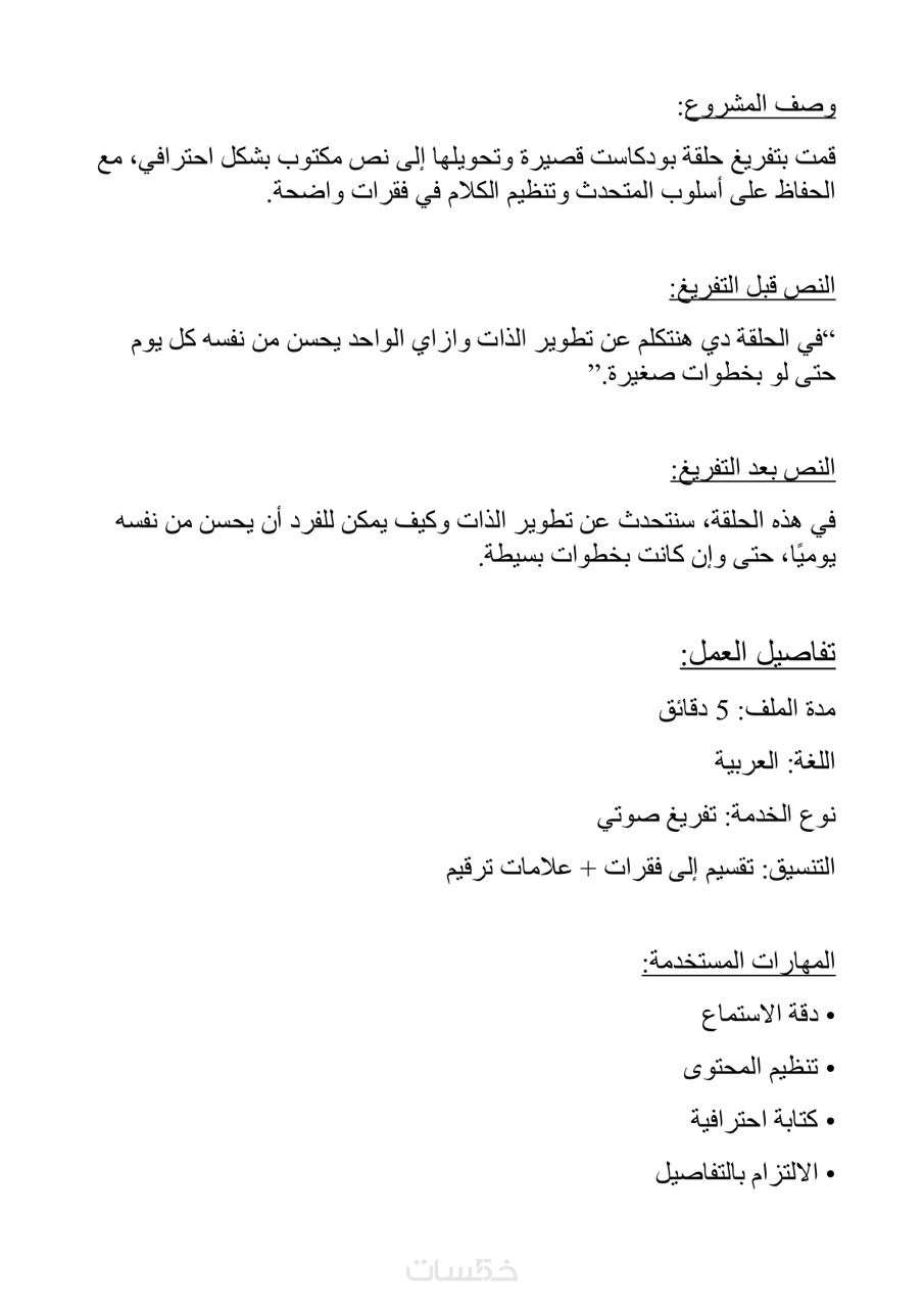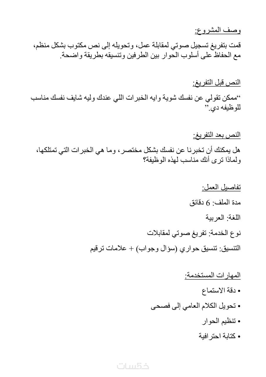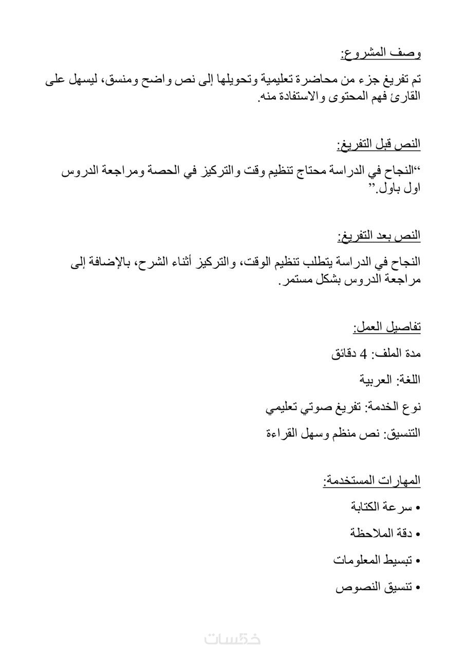 "أهلاً بك، أقدم لك خدمة تفريغ الملفات الصوتية والفيديوهات (محاضرات، بودكاست، يوتيوب) إلى نصوص مكتوبة بدقة واحترافية.