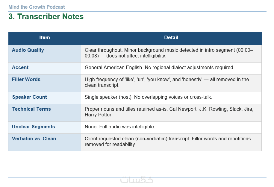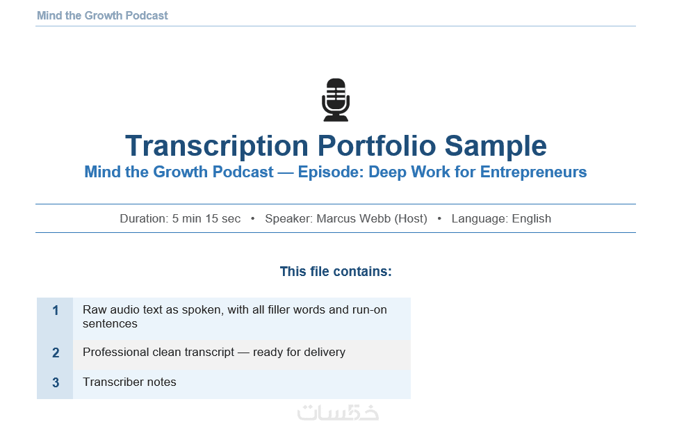 • تفريغ نصي كامل ودقيق باللغة العربية أو الإنجليزية حسب الطلب