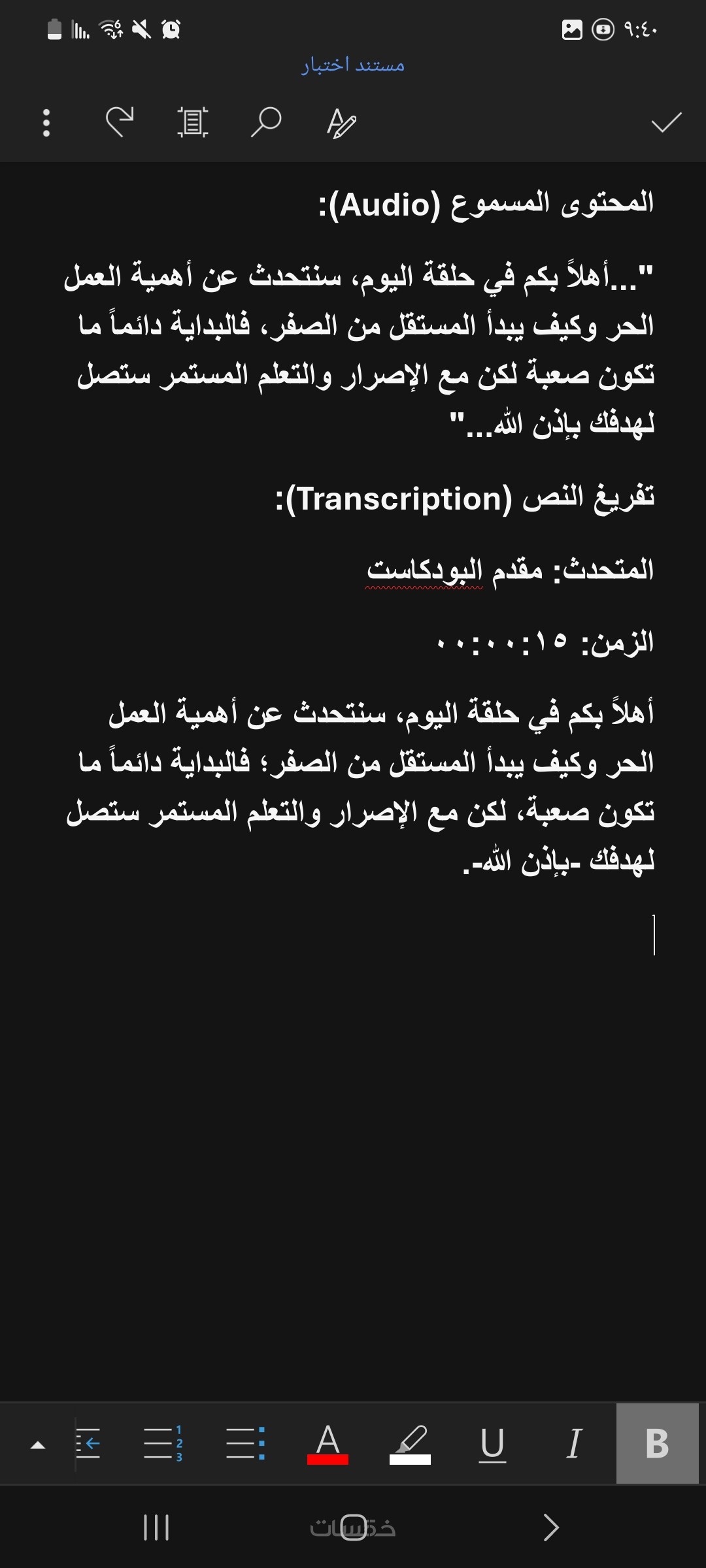 ستحصل على ملف وورد (Word) منظم ومنسق باحترافية يتضمن النص الكامل المفرغ من المادة الصوتية، مع تدقيق لغوي شامل لضمان سلامة اللغة.