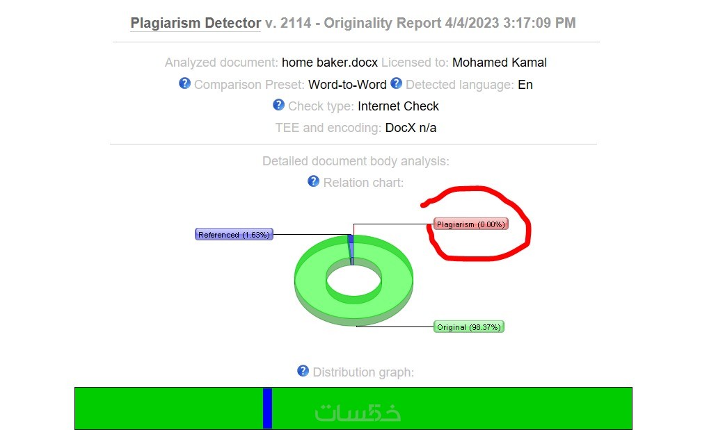 اسم البرنامج هو Plagiarism Detector ويعطي تقارير بعد مدة من رفع الملف بإستطاعتك ان تحصل على تقرير عن بحثك ونسبة الاقتباس من كل موقع والمواقع التي وجد فيها نفس الفقرات ونسبة الاخذ من كل موقع مع الالوان كما في الصورة.