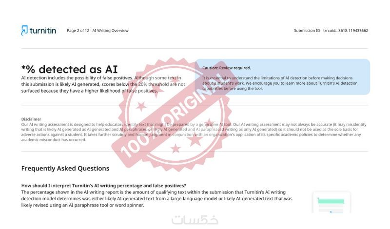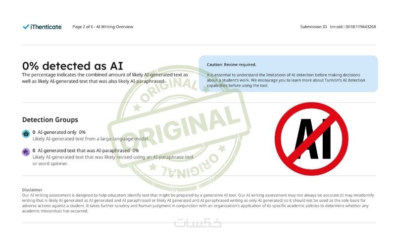 - شفافية تامة وأمان مضمون: سأقدم لك تقارير مفصلة توضح نسبة الكتابة بالذكاء الاصطناعي قبل وبعد التعديل، لتطمئن على جودة العمل. والأهم، نحن نضمن خصوصية ملفاتك؛ لا يتم حفظها أو تخزينها في Turnitin أو أي قاعدة بيانات أخرى.