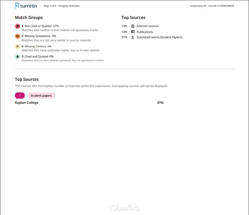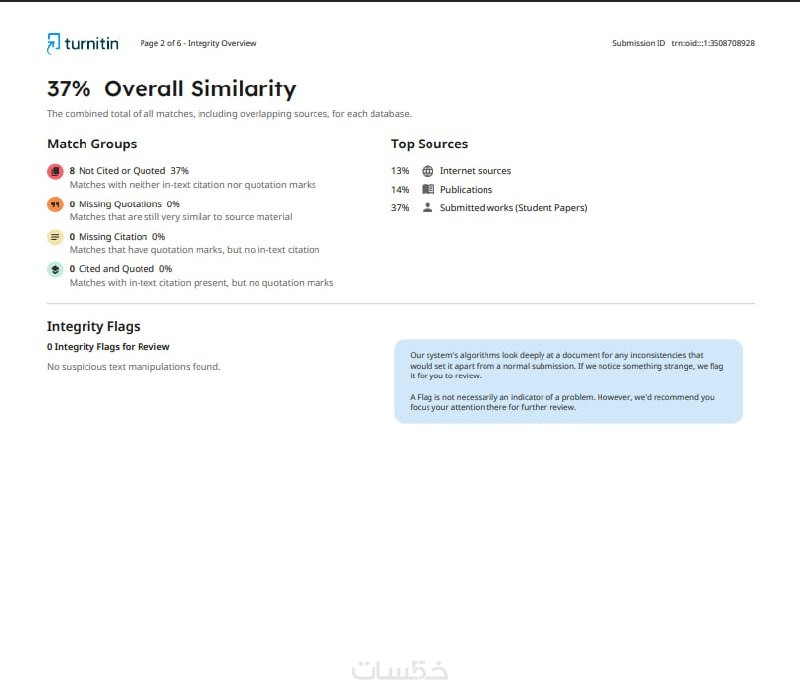 ستحصل على تقرير Turnitin كامل بصيغة PDF يوضح نسبة الاقتباس في الملف بدقة، مع تحديد المصادر المتشابهة وإبراز الأجزاء التي تحتوي على اقتباس، بالإضافة إلى عرض نسبة التشابه الإجمالية بشكل واضح ومنظم. كما يتم تسليم التقرير بسرعة مع الحفاظ على سرية الملف بشكل كامل.