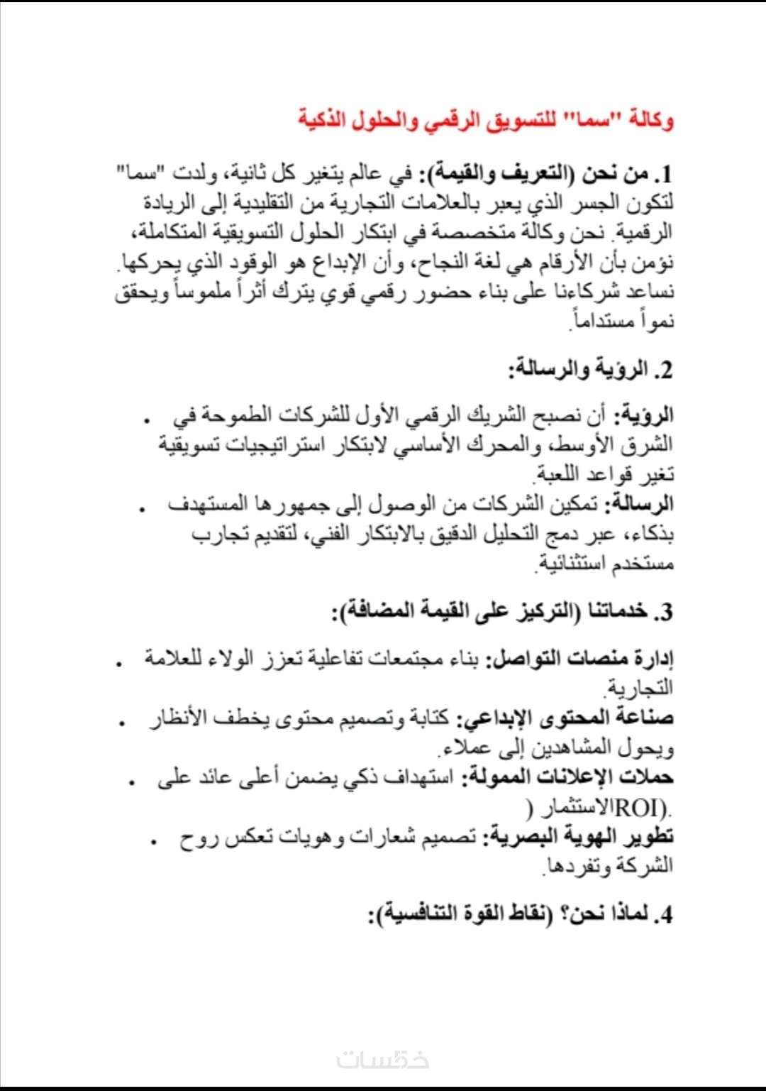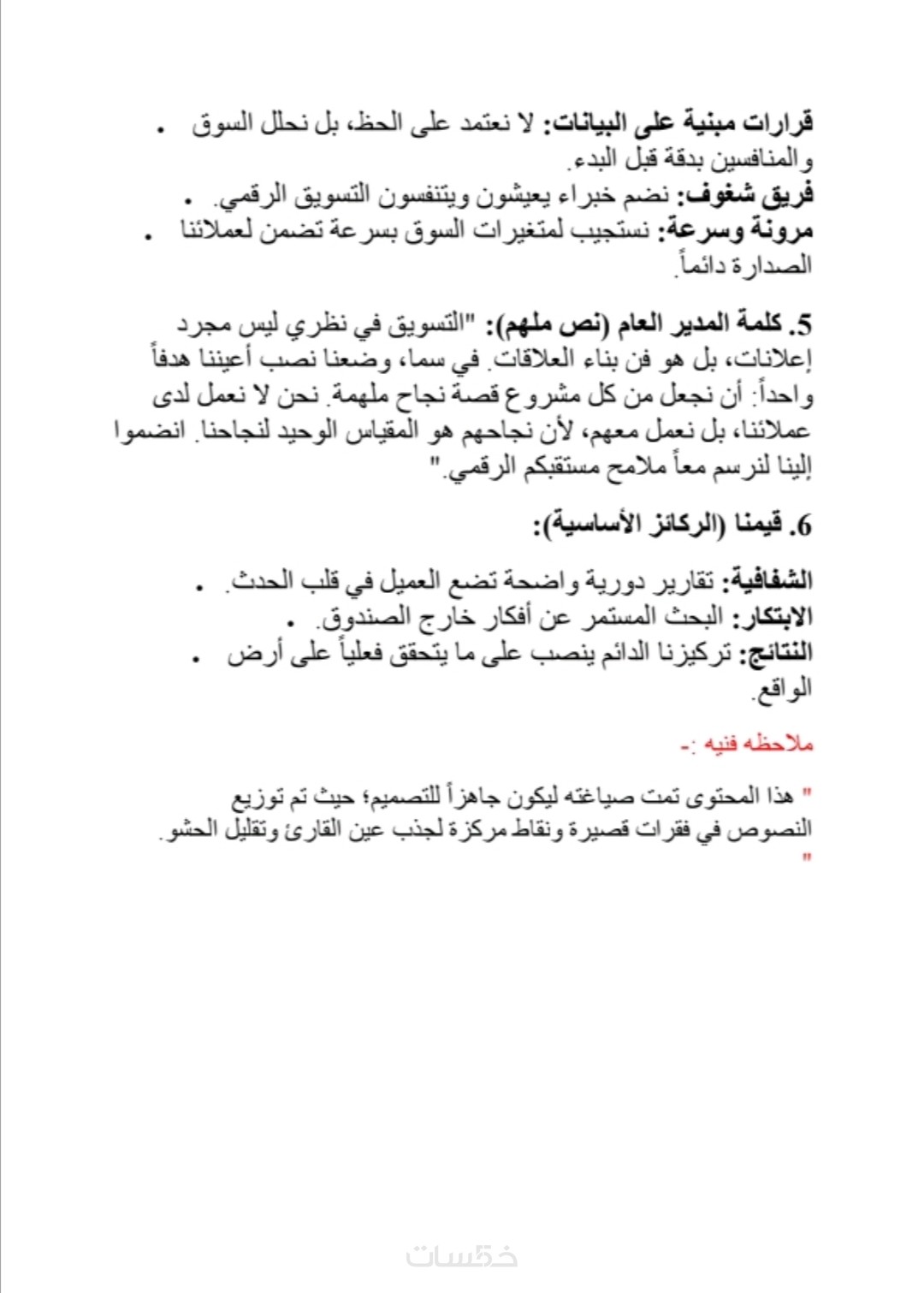تفاصيل العرض: الخدمة الأساسية تشمل صياغة (250 كلمة) تغطي أهم الأقسام (من نحن، الرؤية، والخدمات، لماذا نحن، كلمه المدير العام، قيمنا - الركائز الأساسية ).