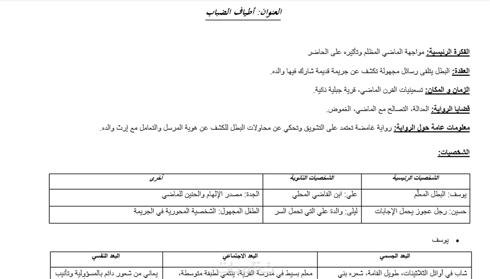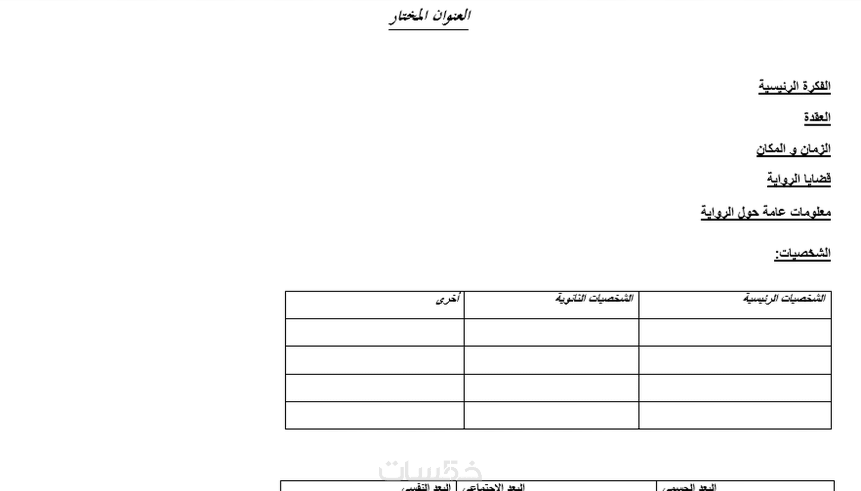 تخطيط أساسي للرواية + جدول وصفي مفصل عن الشخصيات (صفات، أعمار...) + اقتراحات أفكار بداية و نهاية