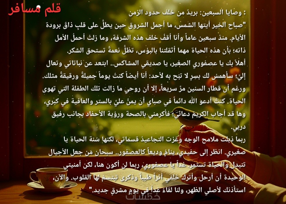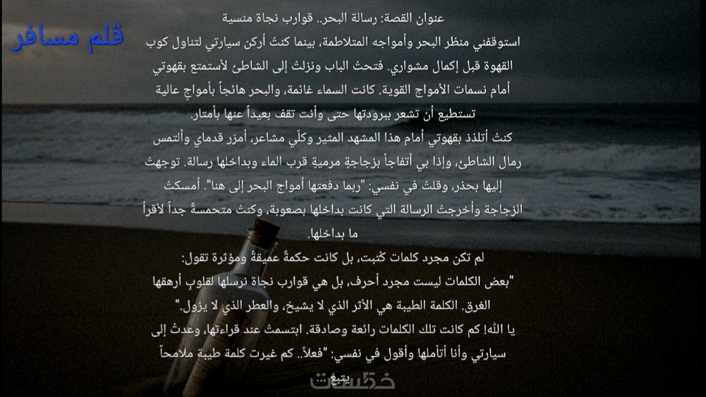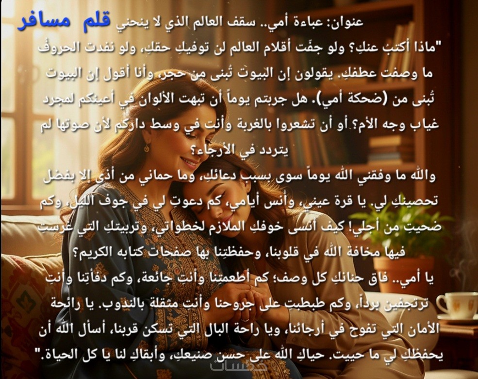 كتابة نص أدبي واحد (خاطرة أو رسالة) بطول 100 كلمة. تنسيق لغوي سليم وخالٍ من الأخطاء الإملائية. إمكانية التعديل مرة واحدة لضمان رضاك التام.