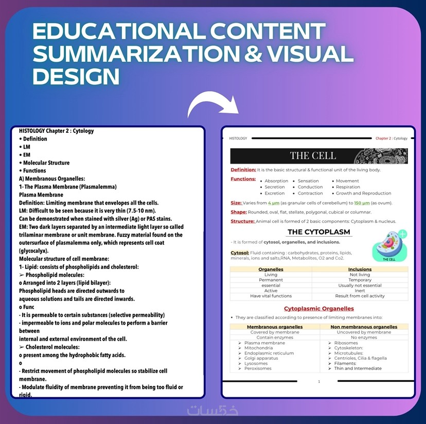 • هندسة بصرية: تنظيم المحتوى في جداول مقارنة، ونقاط مركزة، وخرائط ذهنية لتعزيز الربط الذهني وتثبيت المعلومات.
