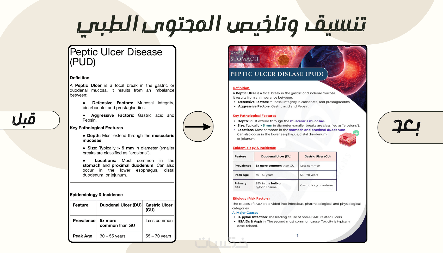 سأقوم بتحويل محاضراتك الطبية المكدسة بالنصوص الجامدة إلى ملخصات ذكية، منظمة، وجاهزة للمذاكرة الفورية أو العرض الأكاديمي، مع ضمان الدقة العلمية التامة.
