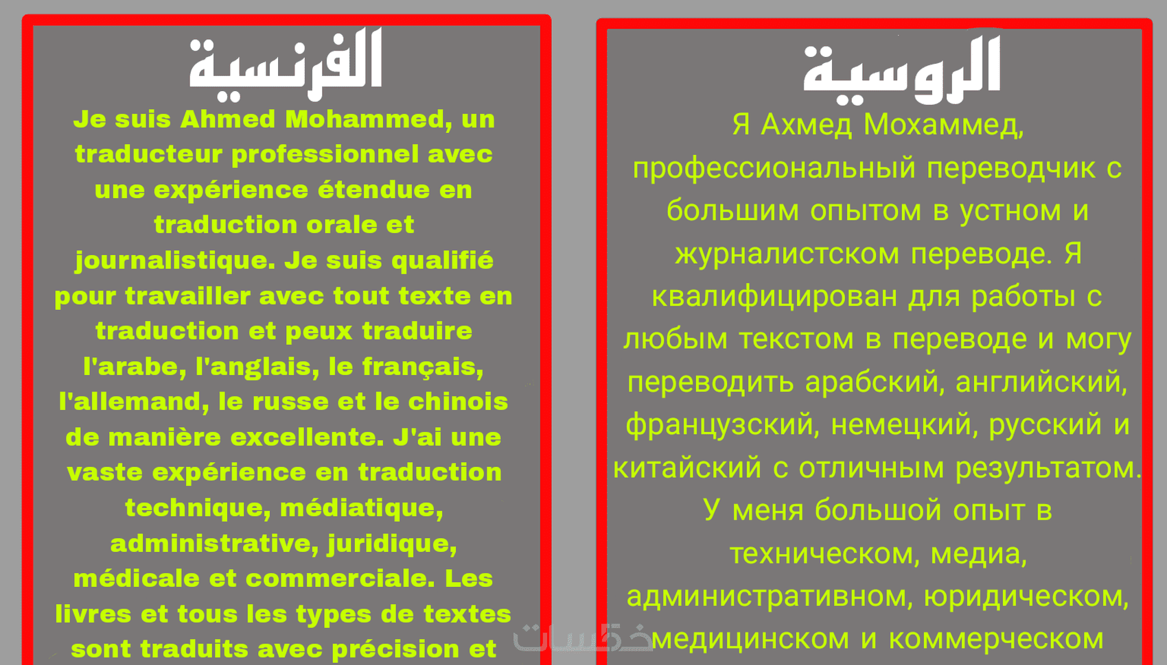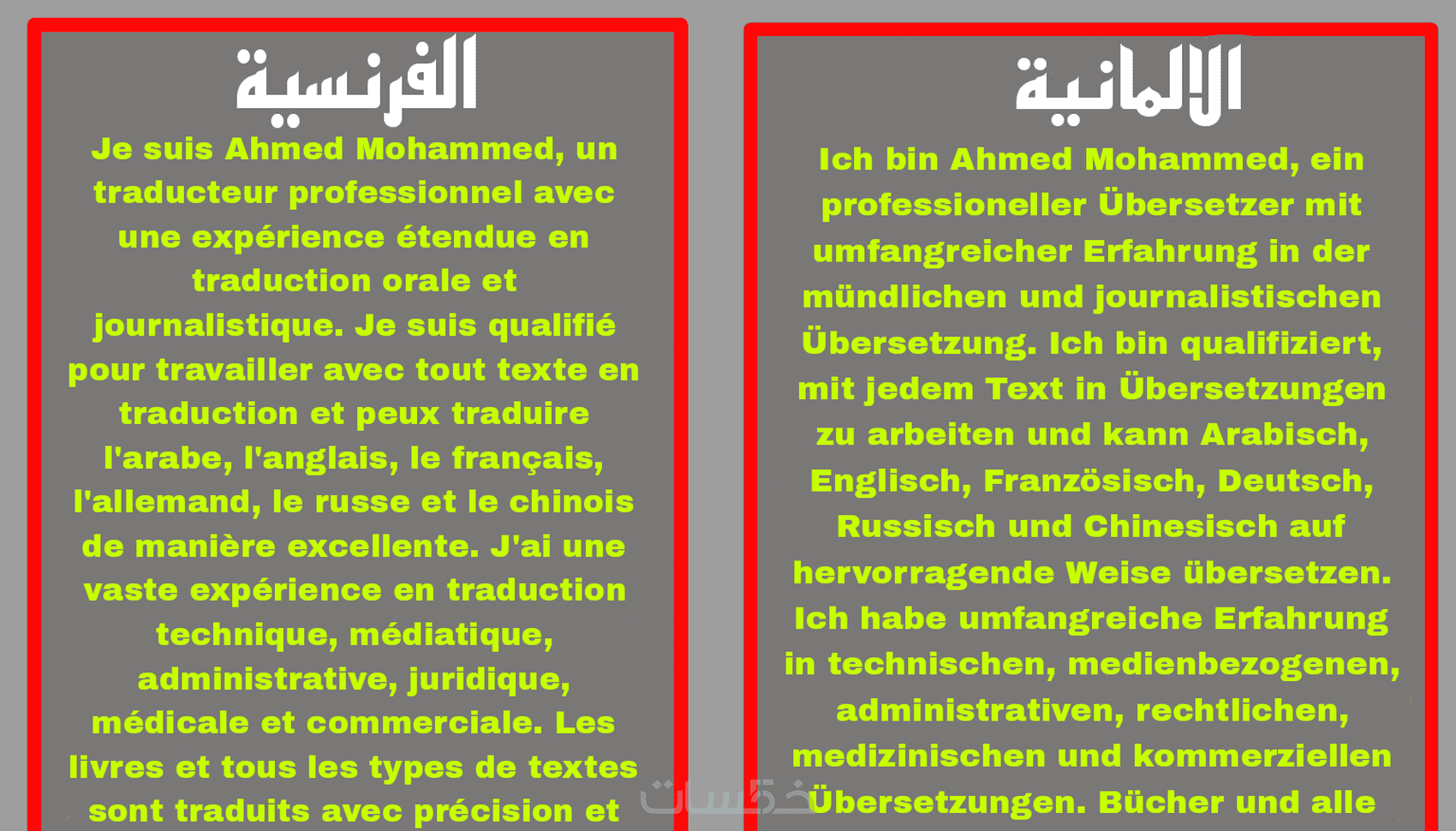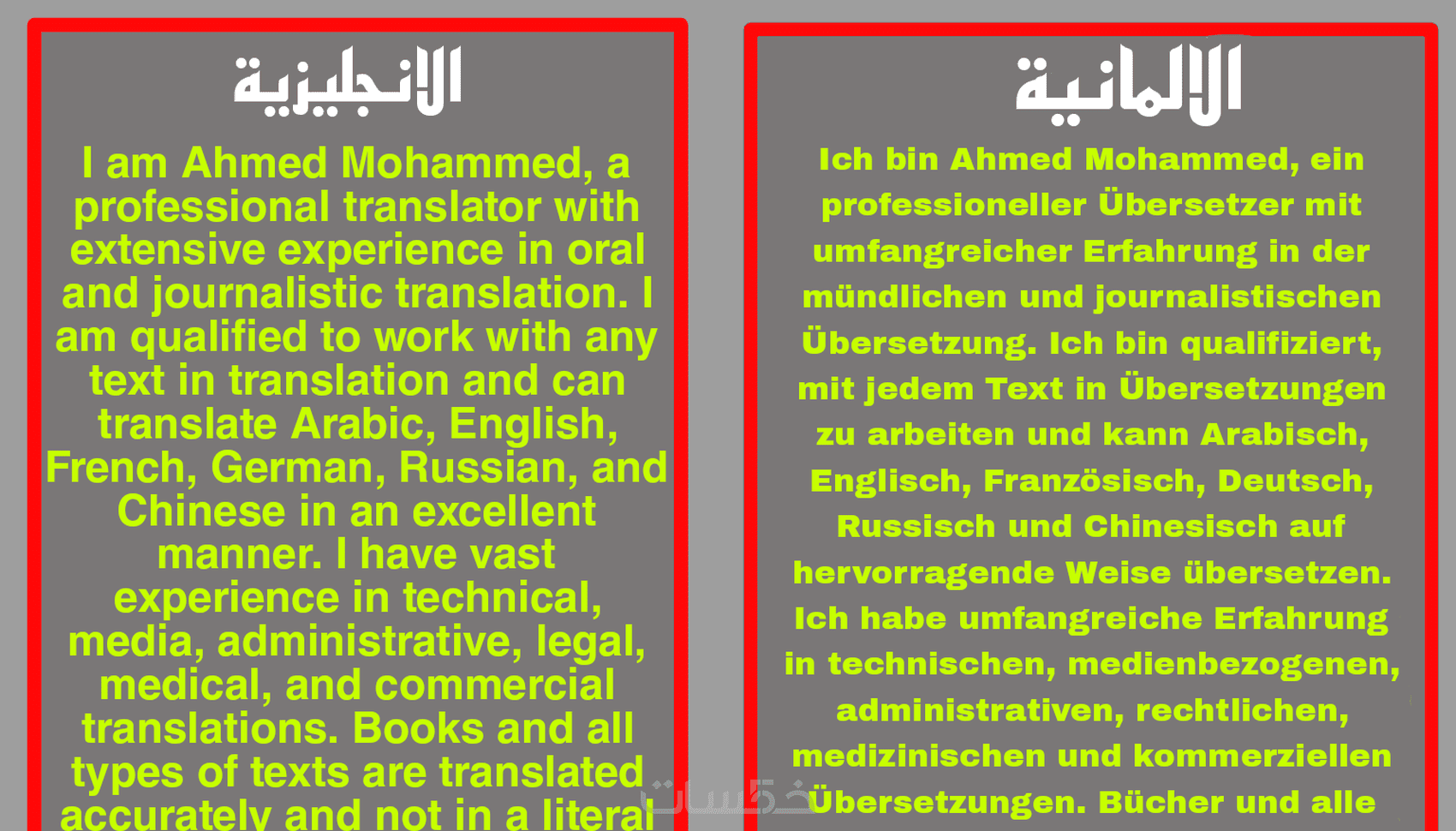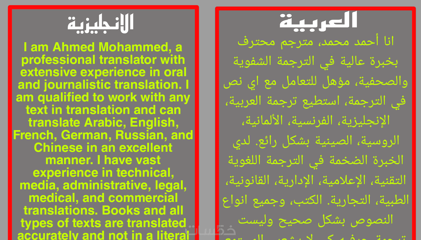 انا أحمد محمد، مترجم محترف بخبرة عالية في الترجمة ، مؤهل للتعامل مع اي نص في الترجمة، استطيع ترجمة العربية، الإنجليزية، الفرنسية، الألمانية، الروسية، الصينية بشكل رائع. لدي الخبرة الضخمة في الترجمة اللغوية التقنية، الإعلامية، الإدارية، القانونية، الطبية، التجارية. الكتب، وجميع انواع النصوص بشكل صحيح وليست ترجمة حرفيه كي لا يشعر، المستمع بالانزعاج وايضا اجيد التدقيق الغوي بشكل ممتاز لجميع انواع الغات المذكوره وايضا لدي بعض الخبره بلغات غير مزكورة ويمكنني ايضاء كتابة مقالات طبخ، رياضة، فن، تكنولجيا، وبعض التخصصات الاخري"