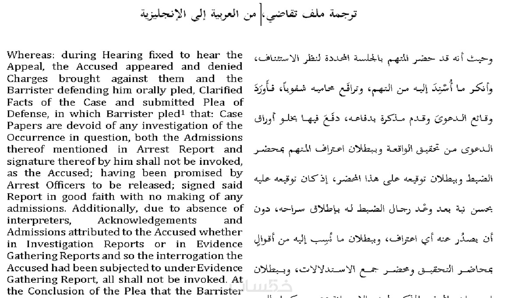 ترجمة يدوية بدون استخدام برامج ترجمة آلية, لتجنُّب الثغرات القانونية التي تظهر في الترجمة بين لغتين, فضلاً عن ظهورها أصلاً في اللغة الواحدة. متوسط عدد الكلمات اليومية من الإنجليزية إلى العربية: 3000 كلمة. المقابل لسعر الخدمة هو للصفحة 250 كلمة.