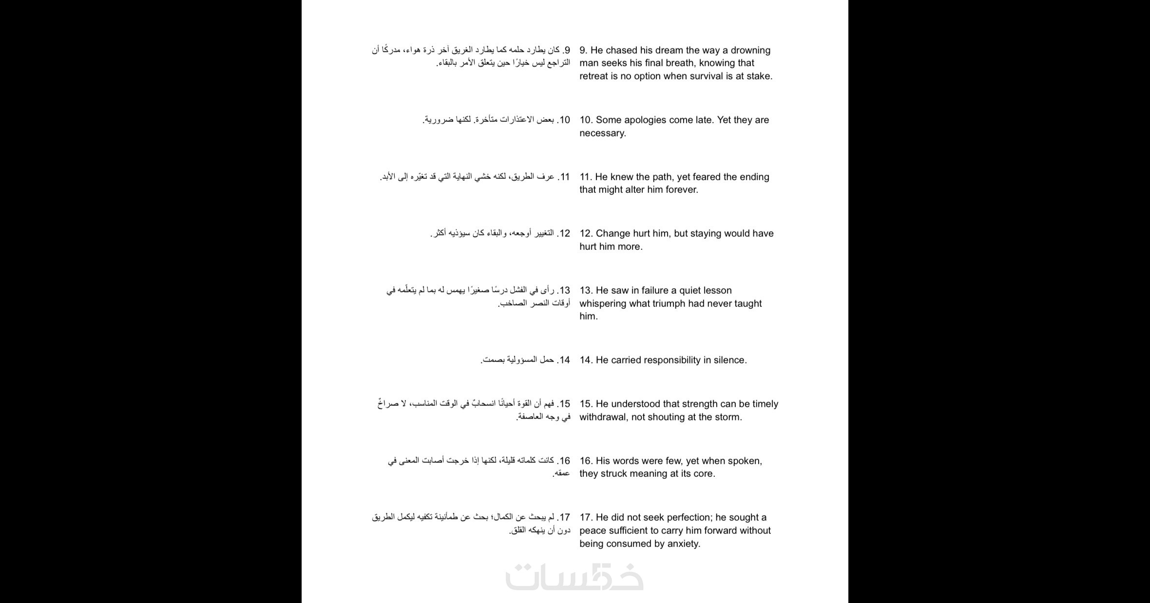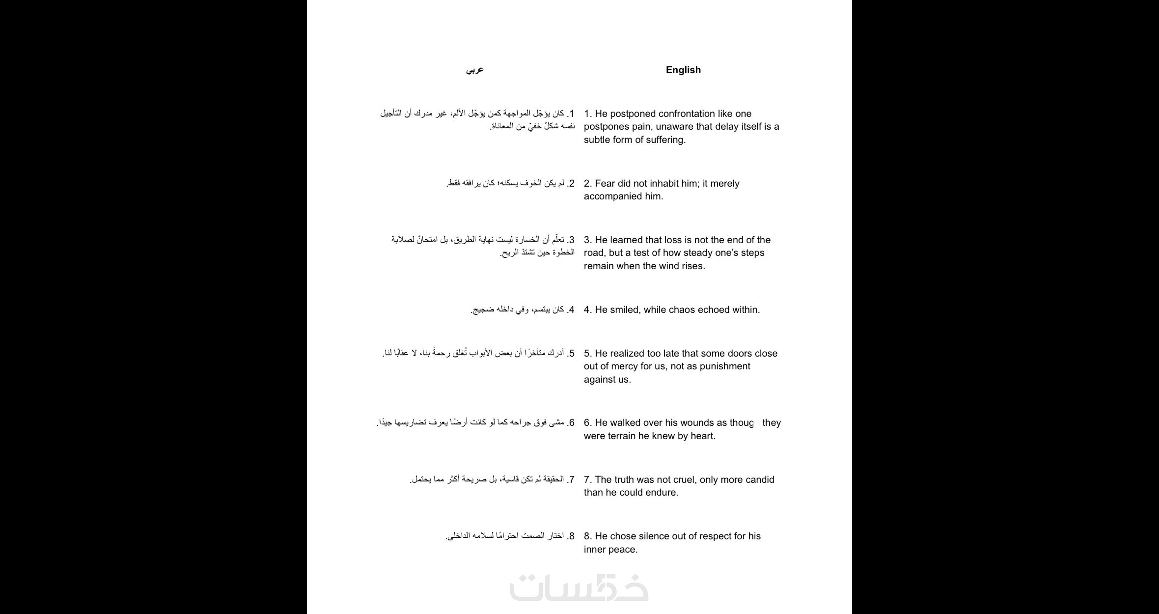 أقدم ترجمة احترافية تتميز بالصياغة السليمة والأسلوب الدقيق، مع الحفاظ على المعنى الحقيقي للنص بعيداً عن الترجمة الحرفية، ليظهر النص وكأنه مكتوب بلغته الأصلية