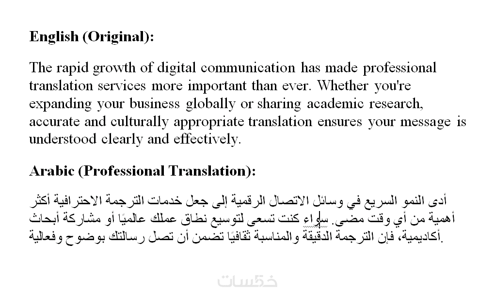نقدم لك خدمة ترجمة احترافية دقيقة وسريعة من اللغة الإنجليزية إلى اللغة العربية والعكس، مع مراعاة السياق والمعنى الثقافي لضمان تواصل فعّال ورسالة واضحة.