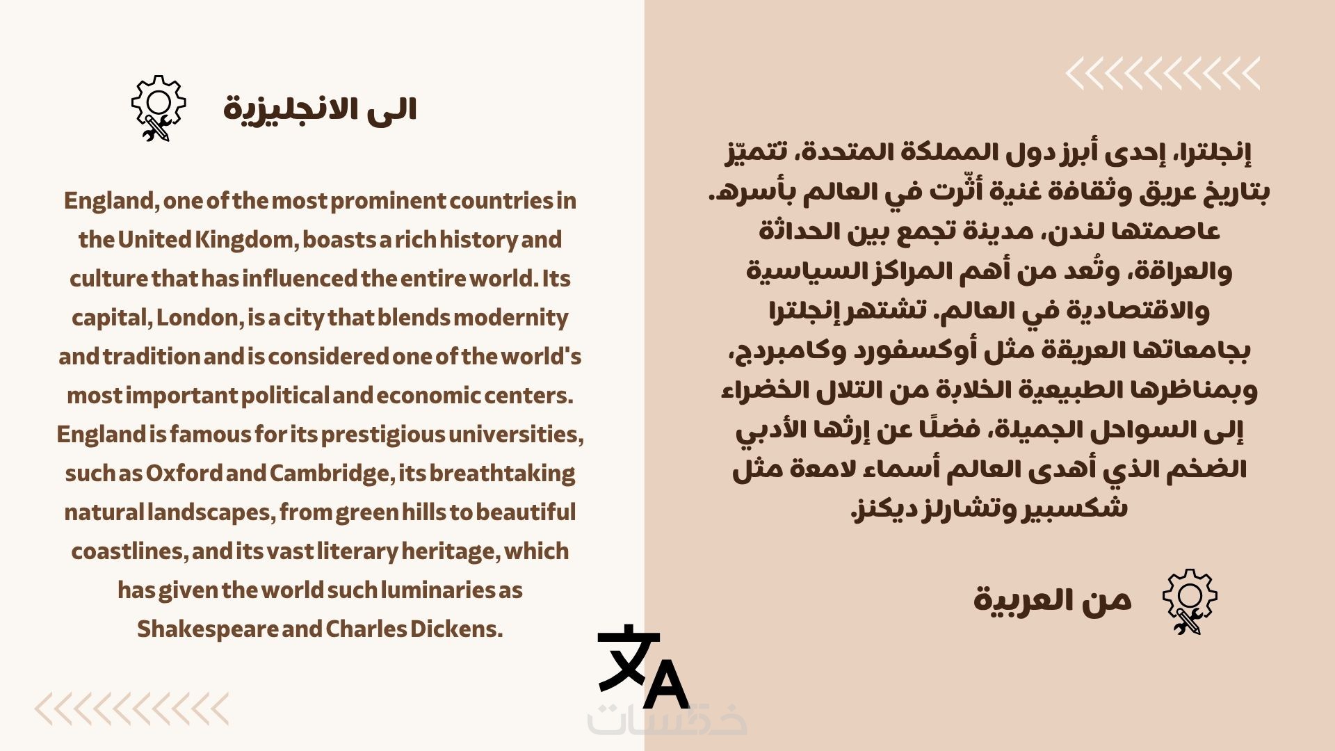 أقدم خدمة ترجمة احترافية للنصوص العامة، المقالات، المحتوى التسويقي، والرسائل البريدية من اللغة الإنجليزية إلى العربية والعكس، مع الحفاظ على المعنى والأسلوب الأصلي للنص.