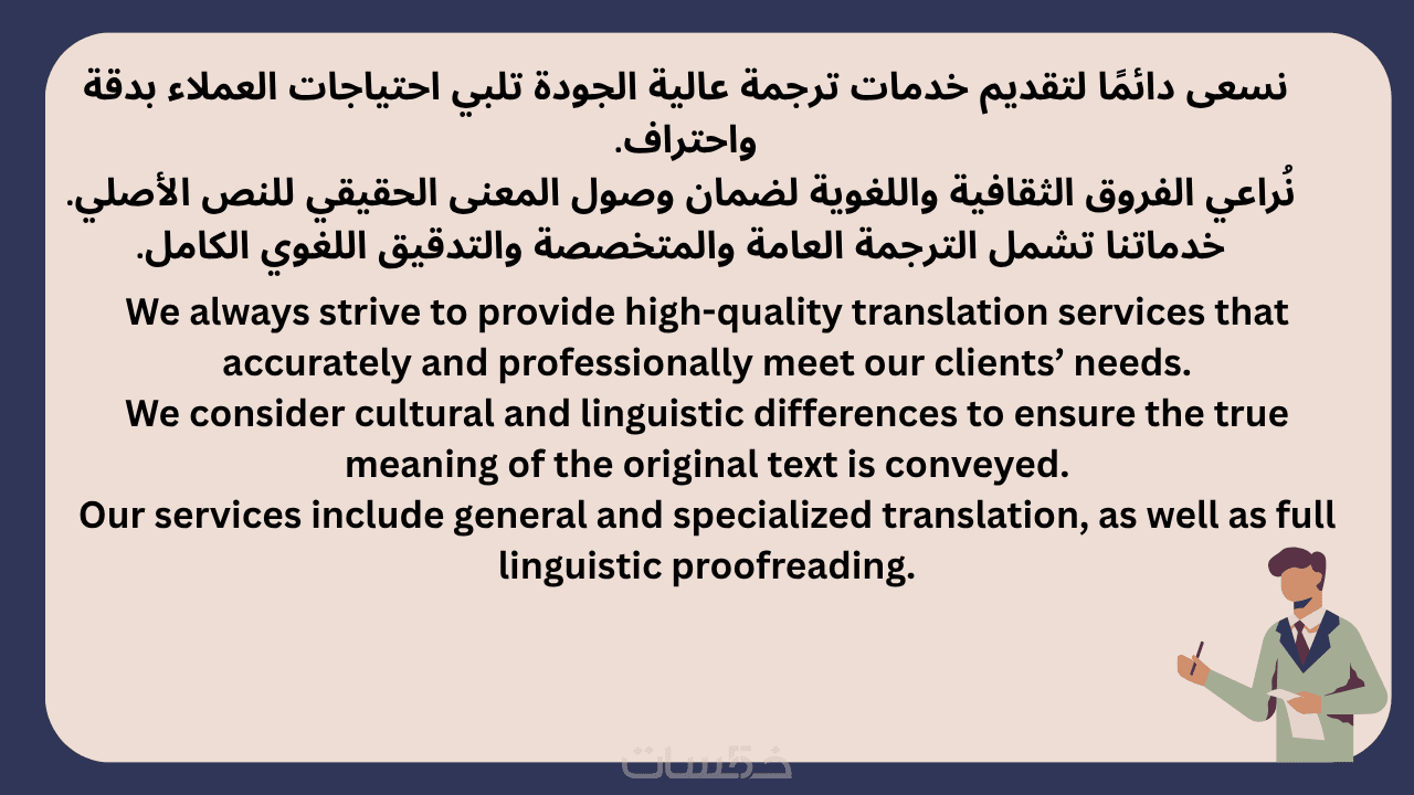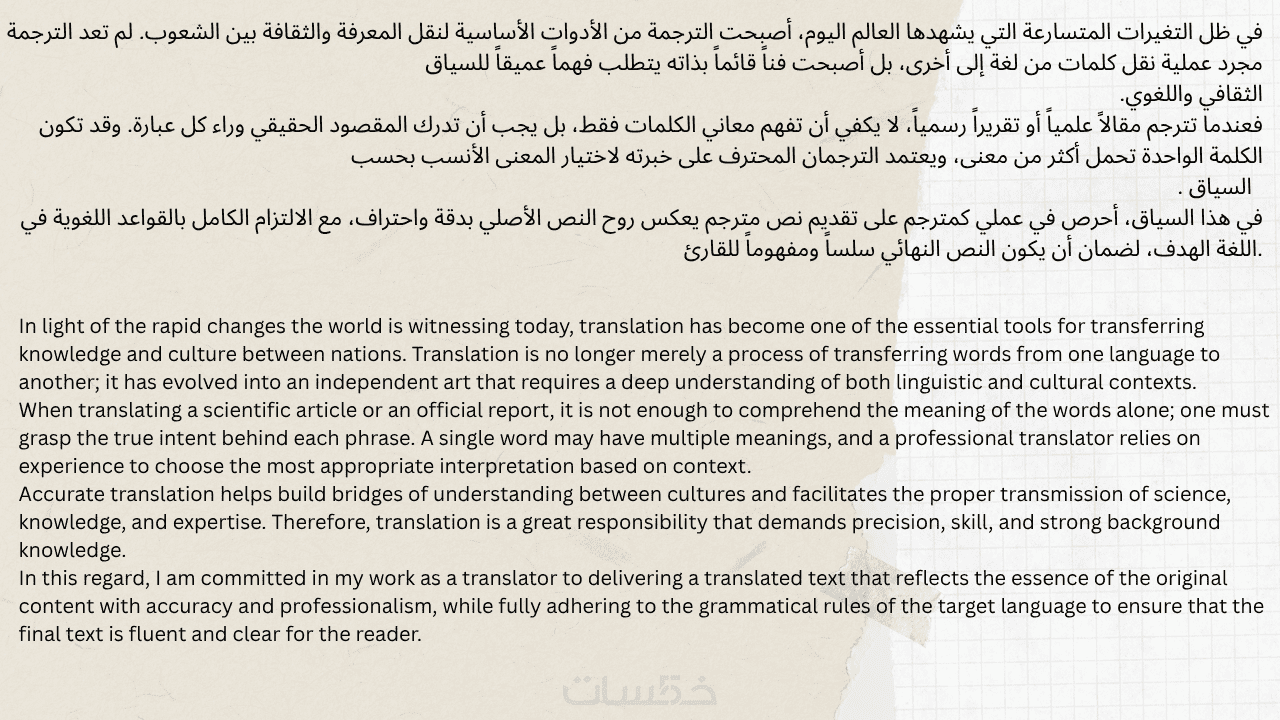 أقدم لك ترجمة احترافية من العربية إلى الإنجليزية والعكس بدقة لغوية واحترافية عالية.