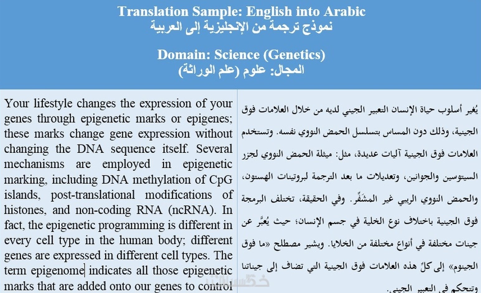 اقوم بترجمة 1000 كلمة من العربية إلى الإنجليزية و العكسأترجم من العربية إلى الإنجليزية / من الإنجليزية إلى العربية بدقة وصياغة للعبارات توصل المعنى.في مجال الترجمة يمكن تسليم الملف بصيغة docx أو pdf