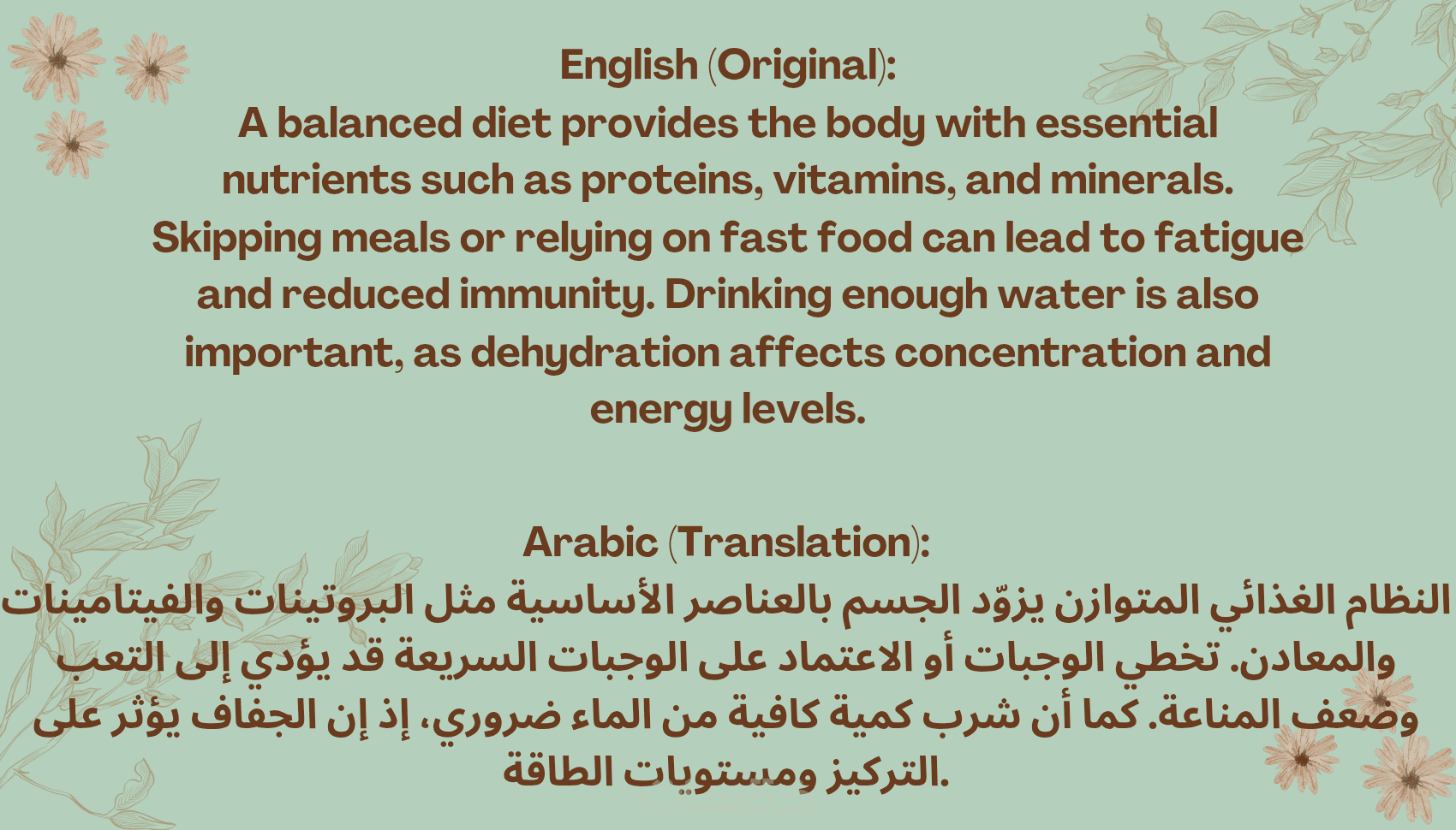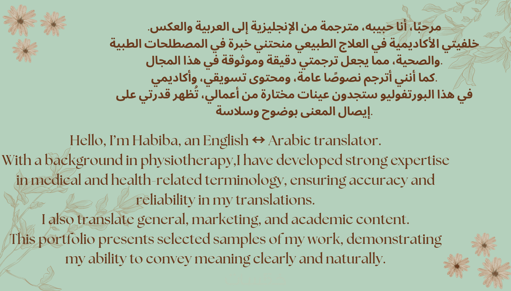 انا مترجمه بخلفيه أكاديمية في المجال الطبي و الصحي اقدم ترجمه تراعي المعنى و السياق بعيدا عن النقل الحرفي