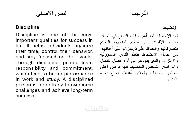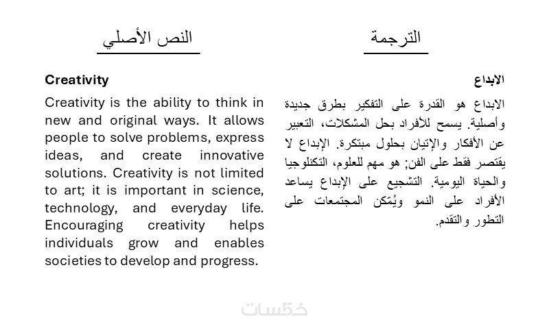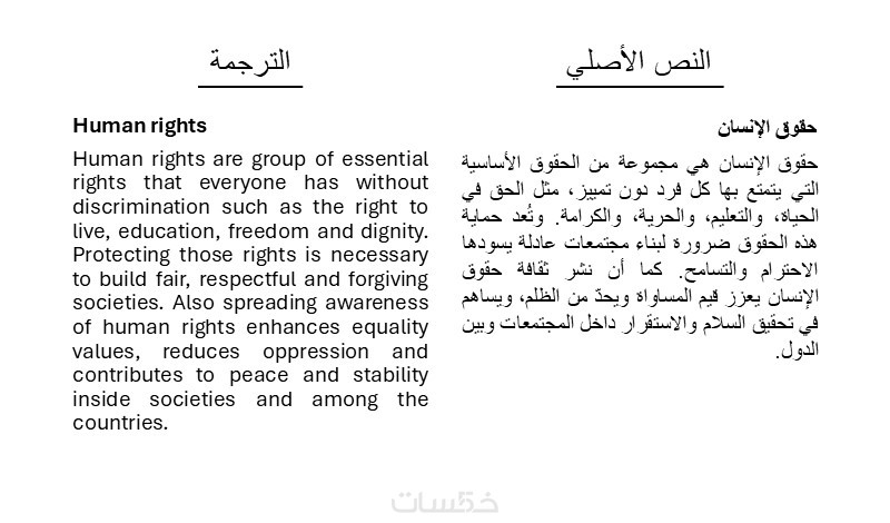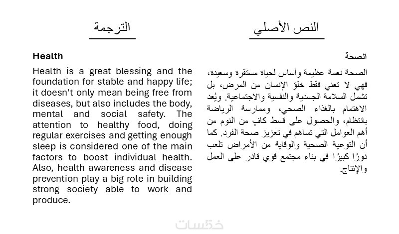 ترجمة لأي نص بمختلف المجالات، المواضيع والقوالب من الإنجليزية إلى العربية أو من العربية إلى الإنجليزية في حدود 500 كلمة.