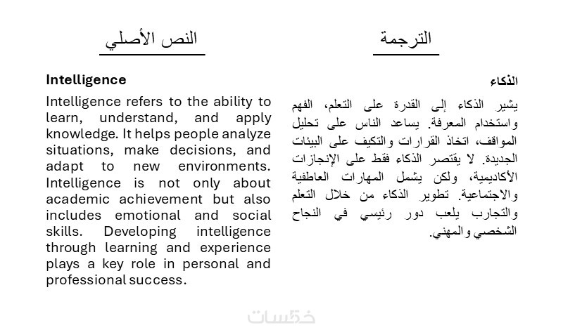 ترجمتُنا تتم بشكل يدوي بالكامل بالاستناد إلى قواميس اللغة الإنجليزية والعربية المعتمدة، ونُراعي فيها السياق، موضوع النص وهدف الاستخدام للحصول على أفضل النتائج وأقربها للصحة، بينما الترجمة الفورية وترجمة الذكاء الاصطناعي ترجمة حرفية، لا يُراعى فيها السياق، تقع بالكثير من الأخطاء وتُضيّع المعنى.
