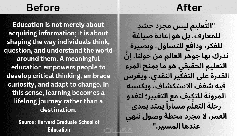 ما الذي سأقدمه لك عند التسليم؟ملف نصي منقح: سأقوم بتسليمك ملف (Word) أو (PDF) يتضمن الترجمة النهائية، مع مراجعة كاملة لضمان الانسيابية.تنسيق مطابق للأصل: سأحرص على أن يكون تنسيق النص المترجم (الفقرات، العناوين، الجداول) مطابقاً تماماً لملفك الأصلي قدر الإمكان.مسرد بالمصطلحات (عند الطلب): إذا كان النص تقنياً أو متخصصاً، يمكنني تزويدك بقائمة بالمصطلحات الأساسية التي تم توحيدها في النص.تعديلات مفتوحة: أقبل إجراء التعديلات اللازمة حتى نصل إلى الصيغة التي ترضيك تماماً وتخدم هدفك.دقة لغوية ونحوية: النص الذي ستستلمه لن يحتاج إلى مراجعة أخرى؛ فهو جاهز للنشر أو الاستخدام فوراً.