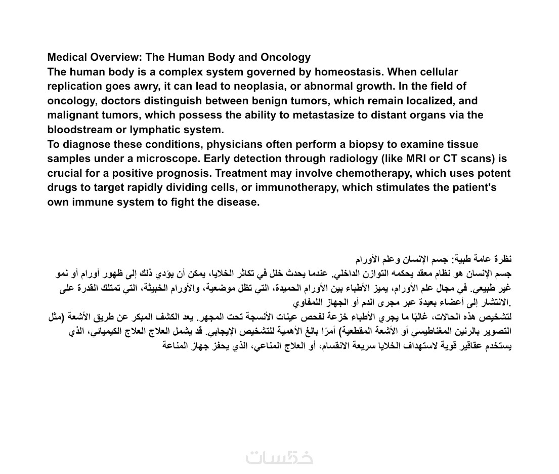 "أهلاً بك. هل تبحث عن ترجمة طبية تجمع بين الدقة اللغوية والفهم العلمي؟ بصفتي متخصصاً في المجال الطبي، أقدم لك ترجمة احترافية للتقارير والأبحاث من الإنجليزية للعربية والعكس.