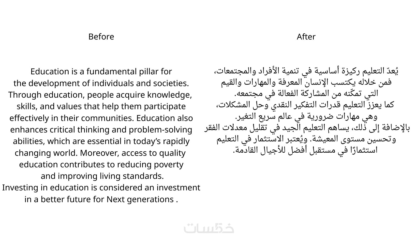 أقدّم خدمة ترجمة احترافية من اللغة الإنجليزية إلى العربية وبالعكس، مع الالتزام بالدقة وسلاسة المعنى والحفاظ على سياق النص الأصلي.
