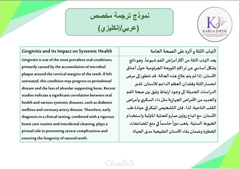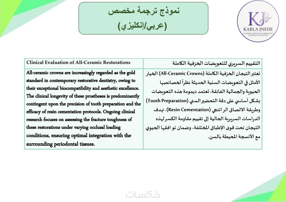 •تخصص حقيقي: ترجمة دقيقة للمقالات الطبية، أبحاث الأسنان، والتقارير العلمية.
