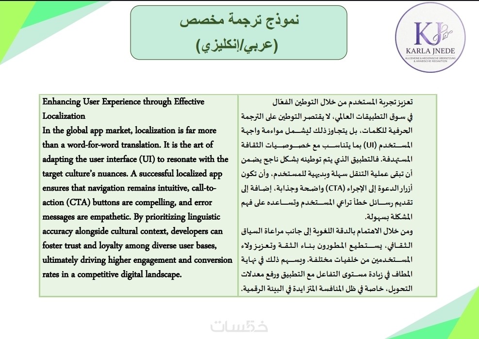 أؤمن بأن الترجمة هي نقل "المعنى" وليست مجرد رص كلمات. جاهزة للعمل على عيناتكم واختبار جودة الأداء قبل البدء.