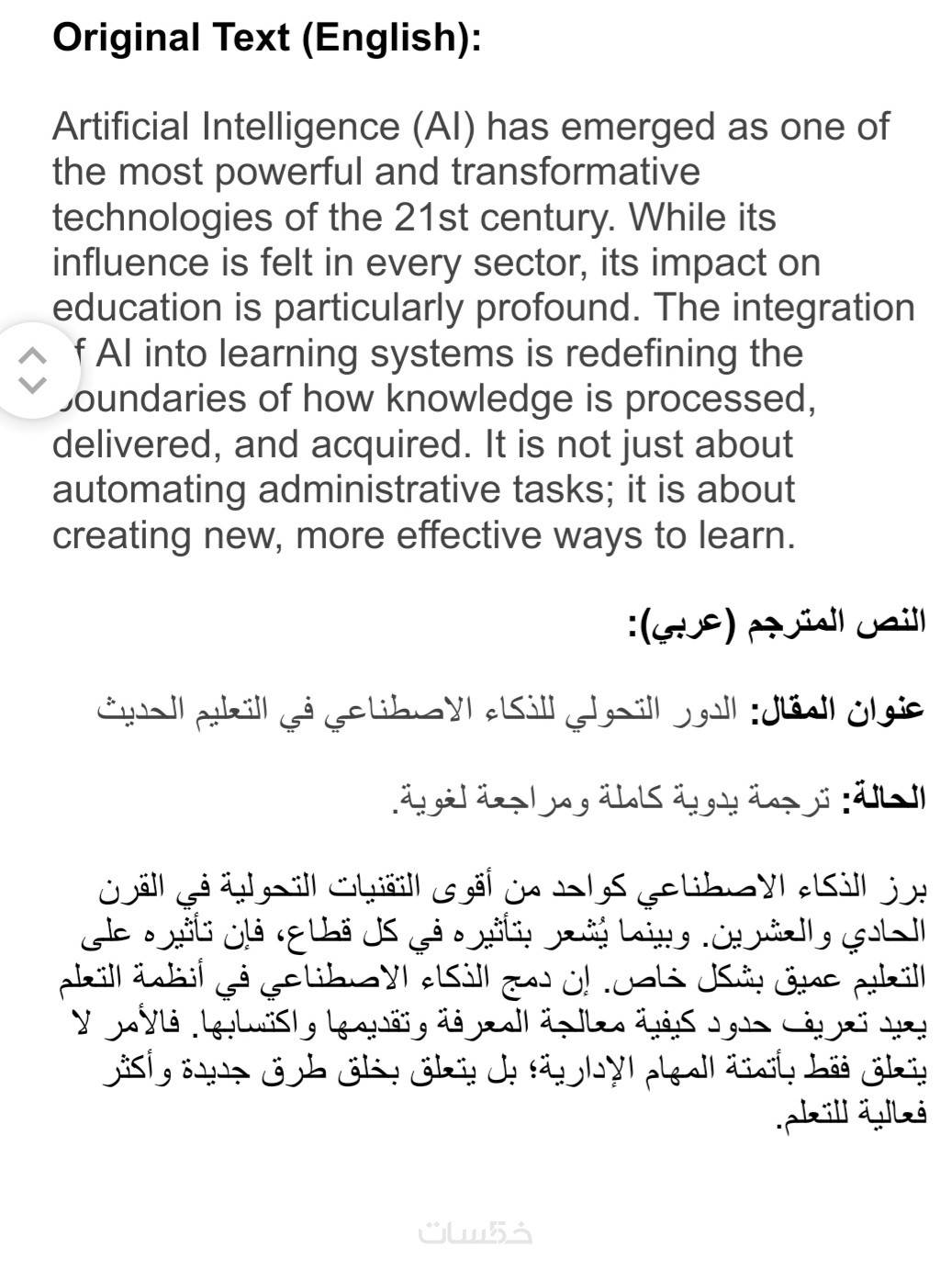 أقدم لك خدمة الترجمة اليدوية والاحترافية من اللغة الإنجليزية إلى العربية وبالعكس. أضمن لك ترجمة دقيقة تلتزم بالسياق والمعنى الأصلي بعيداً عن الترجمة الآلية الحرفية
