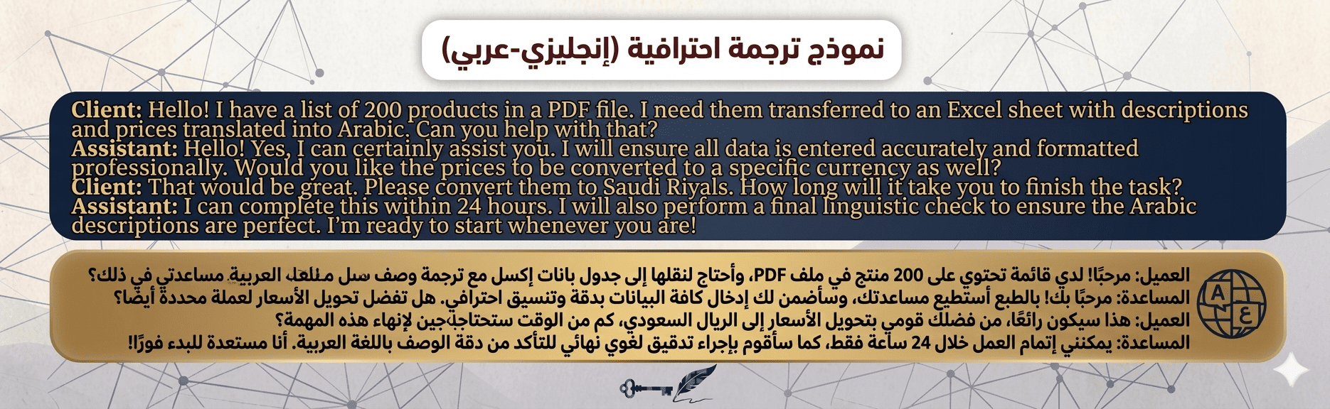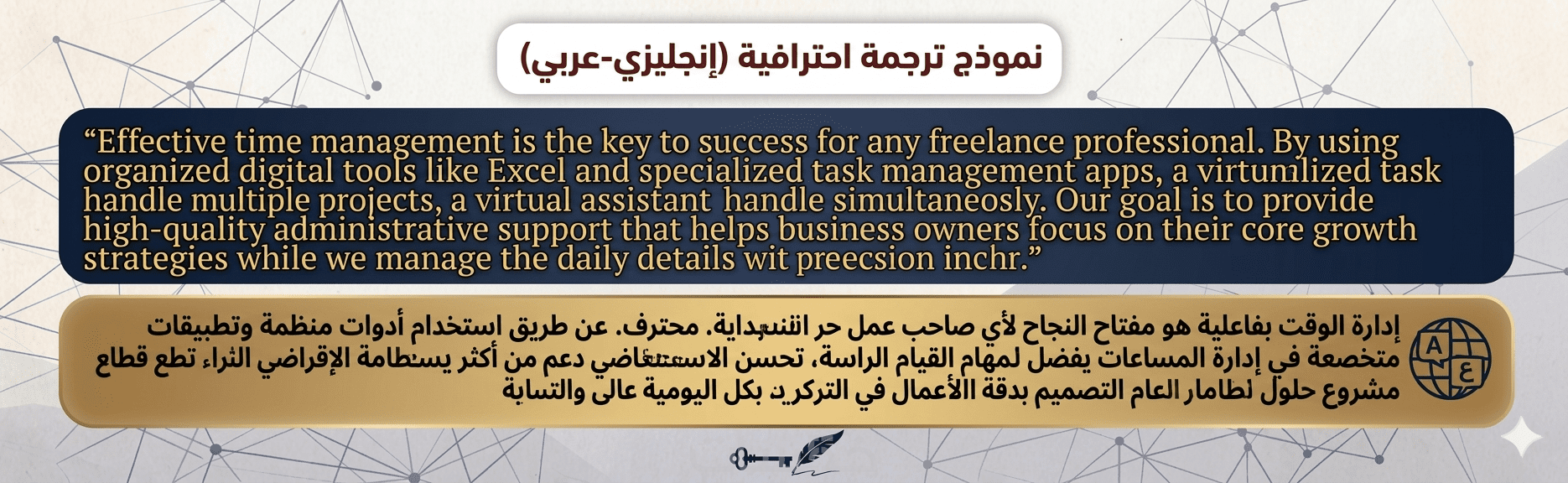 اهلا بك في خدمتي للترجمة الاحترافيةيسعدني تقديم خبرتي لضمان حصولك على نص مترجم بأسلوب لغوي دقيق ومناسب للسياق المطلوب مقابل السعر المحدد سأقوم بترجمة 500 كلمة ترجمة يدوية واحترافية من اللغة الإنجليزية إلى العربية.