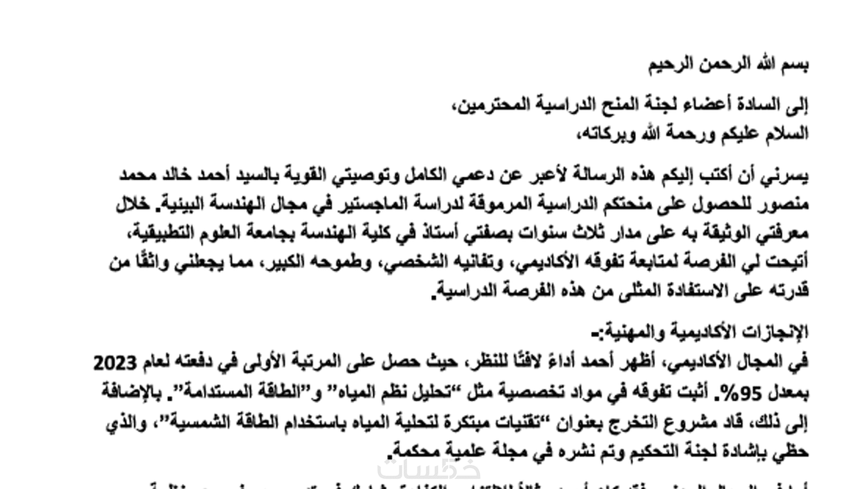 شخص مبدع ومحترف ومتعاون وسريع وليس اول مره اتعامل معك بل المرة الثالثه تم قبولي بالمنحة في دوله اجنبيه بسبب الخطاب الذي كتبته لي ولكن فضلت منحه اخرى وبفضل الله ثم بفضلك اللجنه المانحة قيموني تقييم ممتاز كل هذا من الخطاب الذي قمت بكتابته لي بشكل احترافي أشكرك أخي ولنا المزيد من الاعمال الكثيرة.