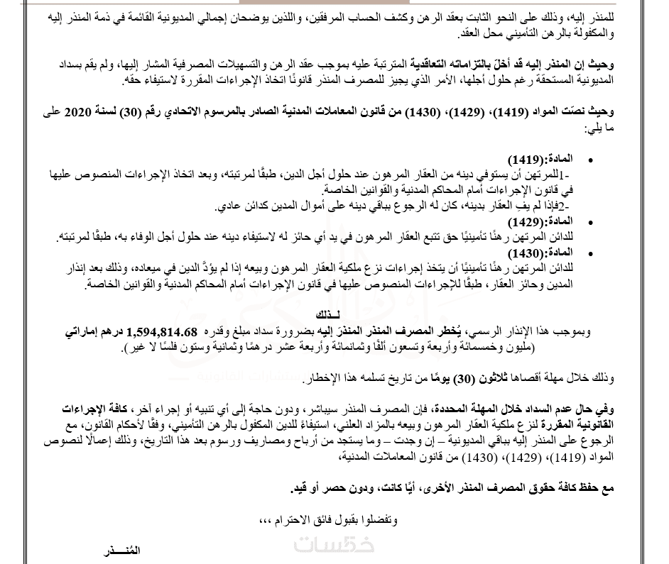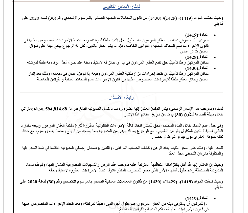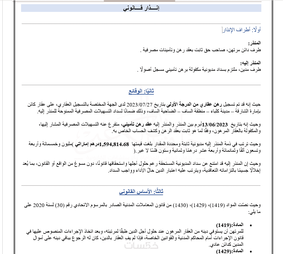– ملف إنذار قانوني واحد مُعد بصياغة قانونية دقيقة من (300كلمه)-– تنظيم احترافي للفقرات – صيغة رسمية واضحة وجاهزة للاستخدام – ملف بصيغة Word أو PDF حسب الطلب