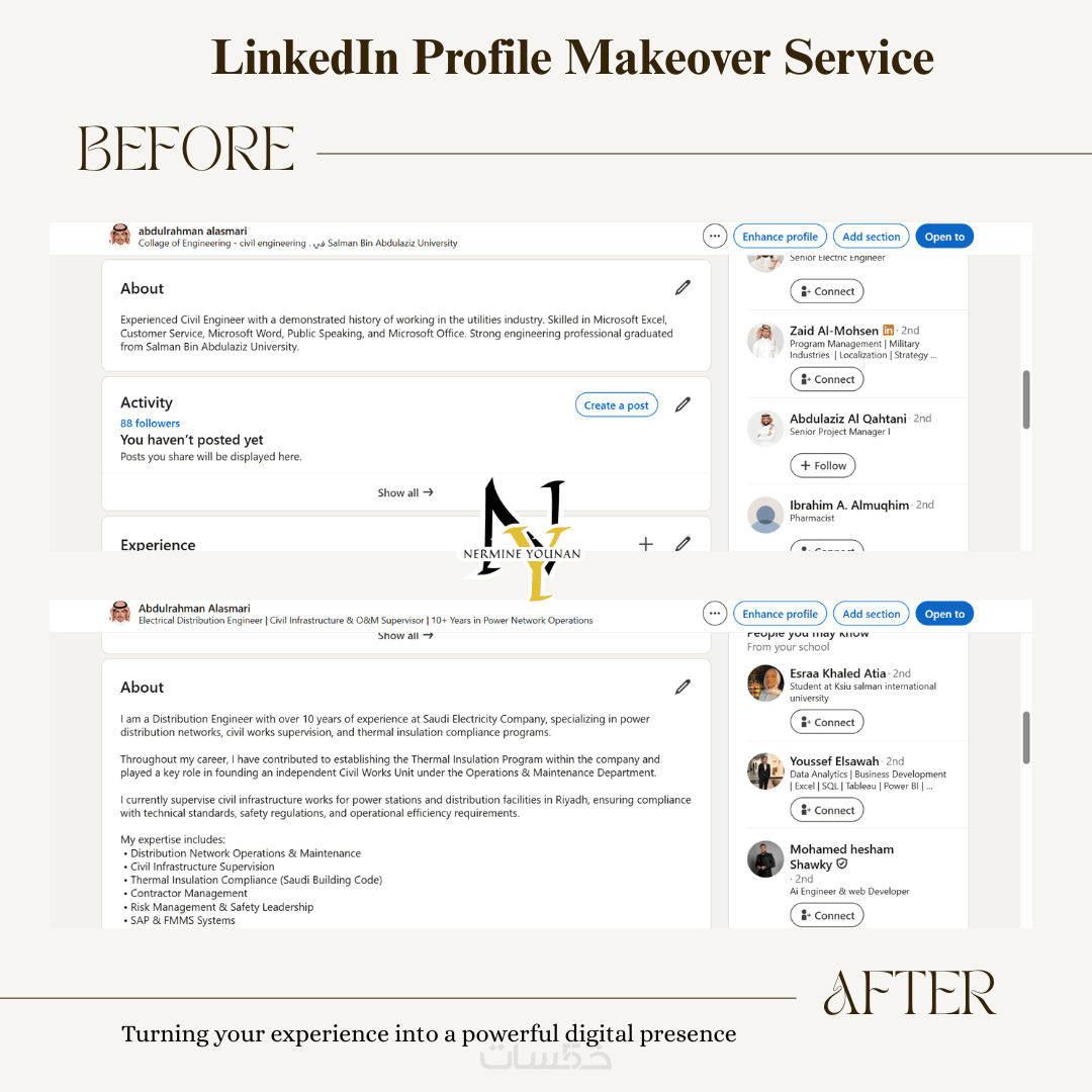 أقدّم لك خدمة تطوير أو تحسين ملفك على LinkedIn لتظهر بأفضل صورة أمام أصحاب القرار.