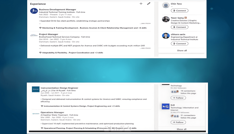 كما أنني حاصل على شهادات معتمدة من منصات LinkedIn Learning وإدراك ومعارف في مجالات كتابة المحتوى المهني وتحسين الملف الشخصي، مما يضمن لك مستوى عالٍ من الجودة والدقة في العمل.