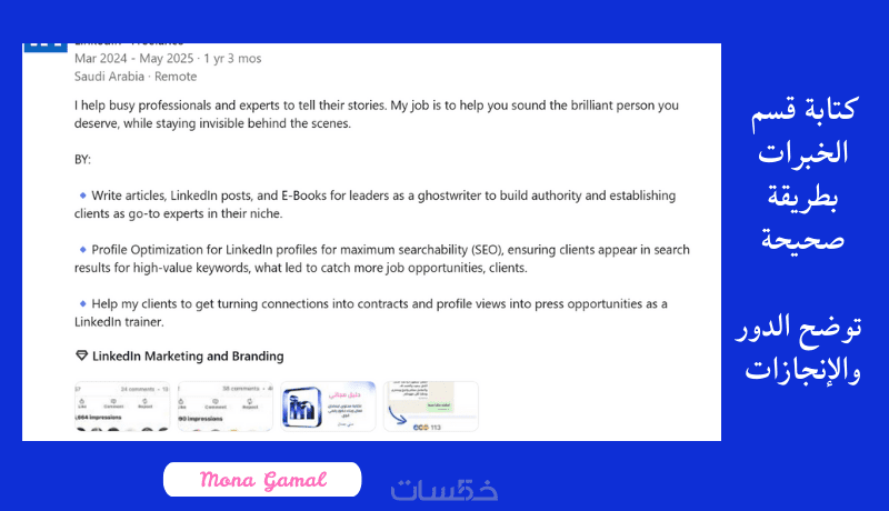 وصف لكل قسم + كلمات مفتاحية + المهارات + أهم خمس مهارات لكل قسم + وصف مفصل للنبذة والخبرات والعنوان + عنوان مقترح للرابط