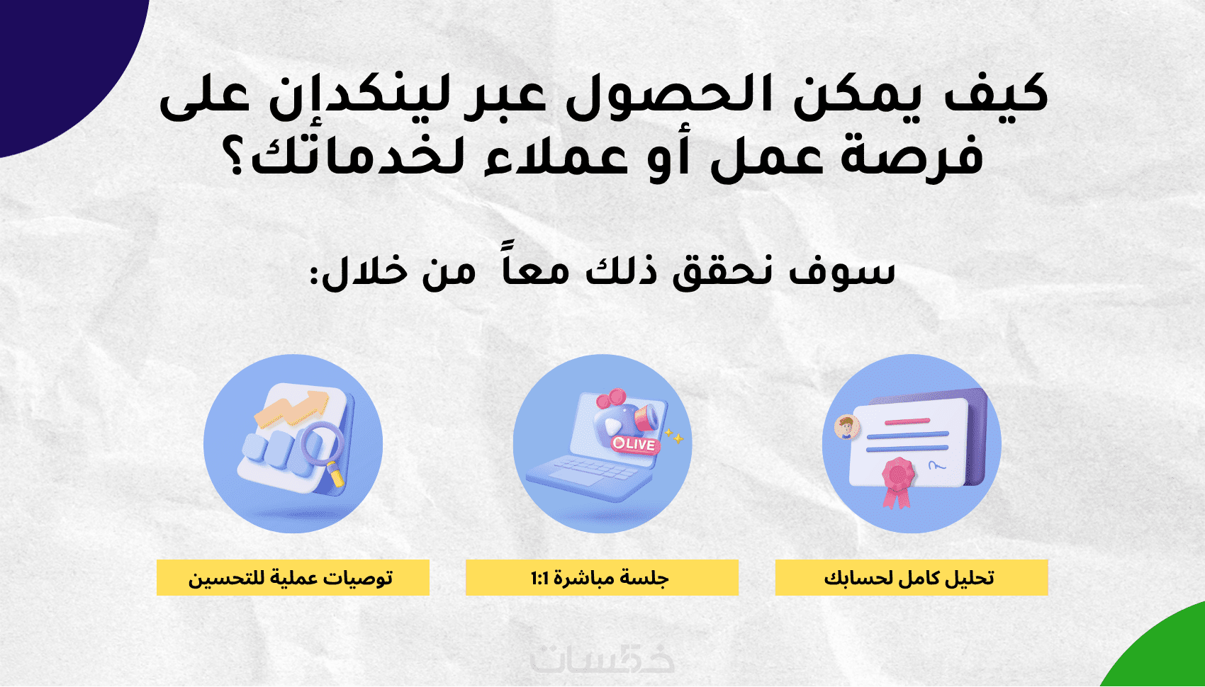 ومن خلال هذه الخدمة سأقدم لك استشارة احترافية لتحليل حساب لينكدإن الخاص بك وتقديم خطة واضحة لتحسينه وزيادة ظهوره على المنصة.